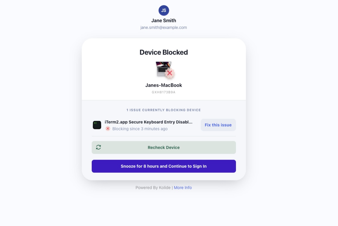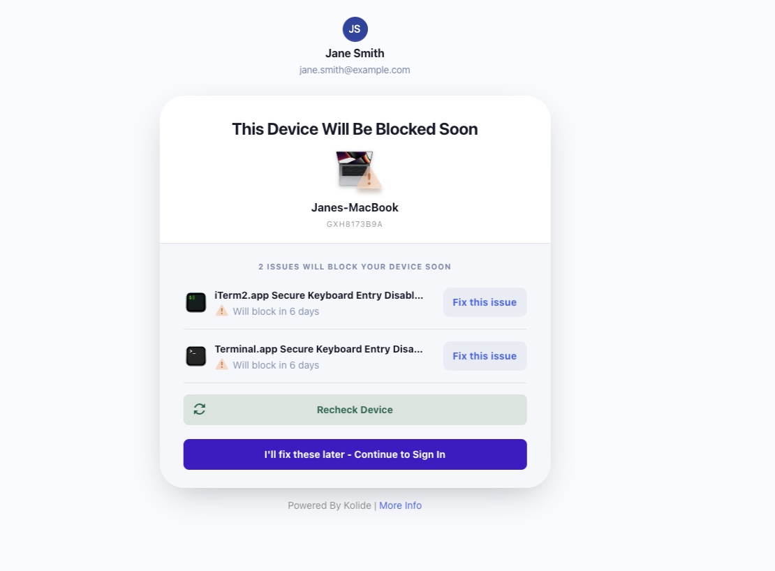 We’ve also changed how often we display our warning page in the event a user is failing a blocking check, but is still within its grace period. With this change, Kolide only warns the user of an issue once every 24 hours, instead of during every authentication flow.