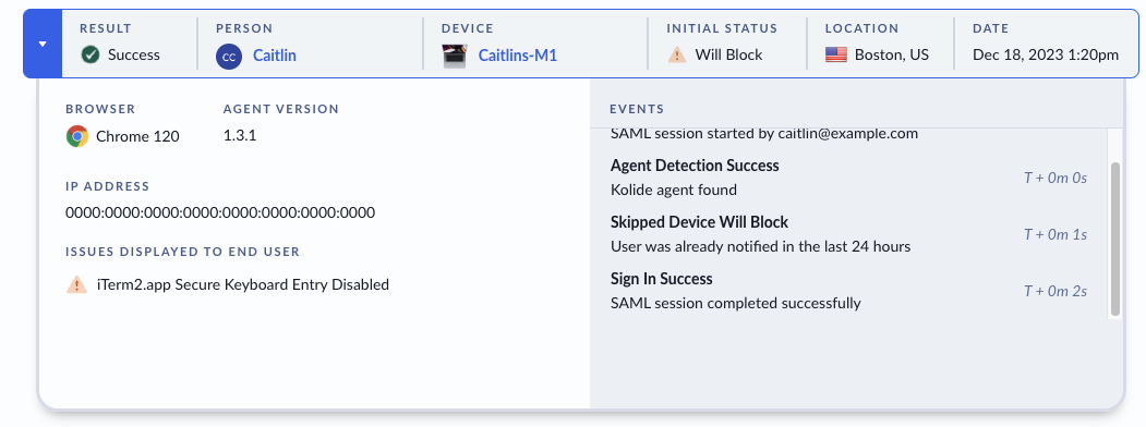 In addition to this expedited authentication flow, we’ve made sure to log when a user has seen the warning screen, so that Kolide admins have full visibility into the authentication processes that make up their fleet.
