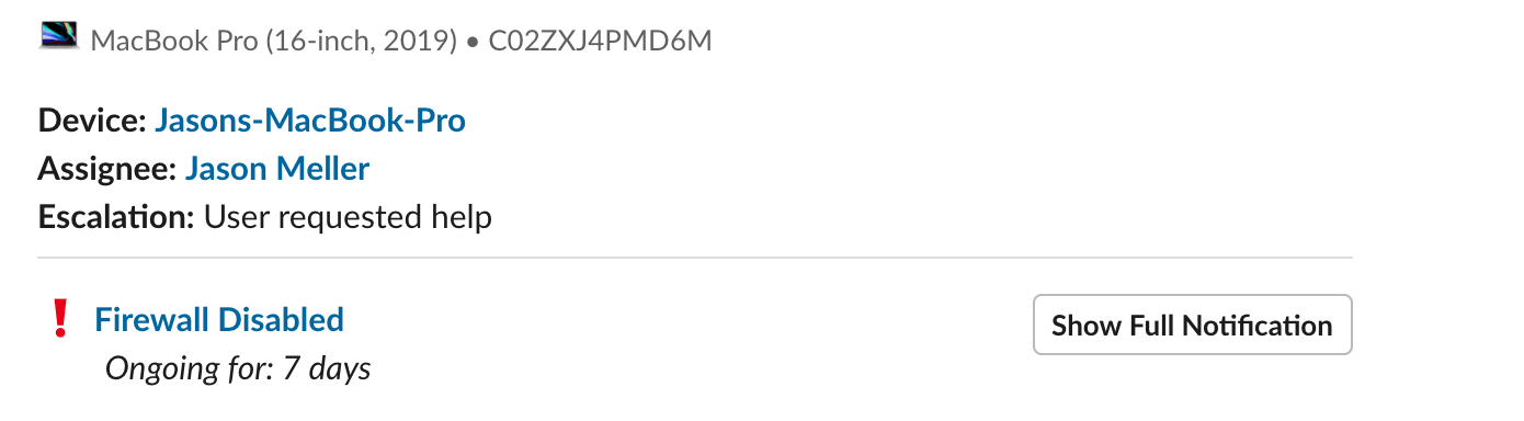 While we implemented this new Slack message user experience, Kolide took the opportunity to improve how failure escalations to administrators are displayed in Slack.