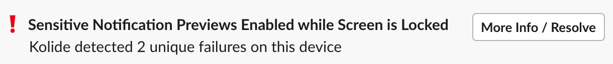 Below is an example failure notification. Notice how Kolide has detected 2 unique failures on this device. Now when you click “More Info / Resolve”…