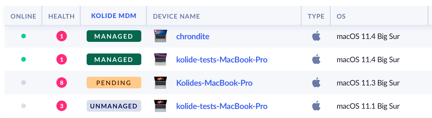 For those taking advantage of our MDM capabilities, we’ve added a new column in Inventory called “Kolide MDM.” This will enable sorting and filtering by the managed state of the device.