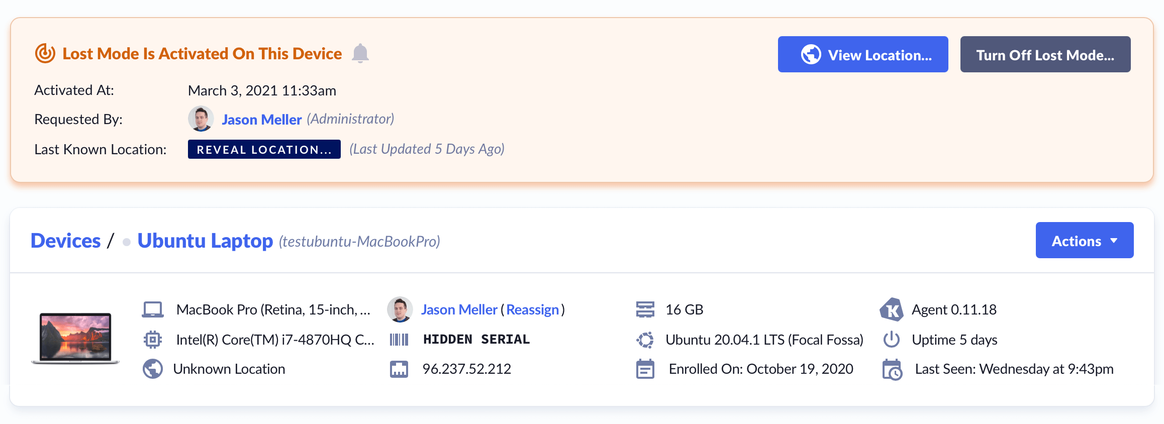 Early in January, we introduced Lost Mode for Mac, a beta feature in which the security team and end-users can work together to locate a device that was either misplaced or stolen. We are now excited to announce this same functionality is now available on Linux devices!