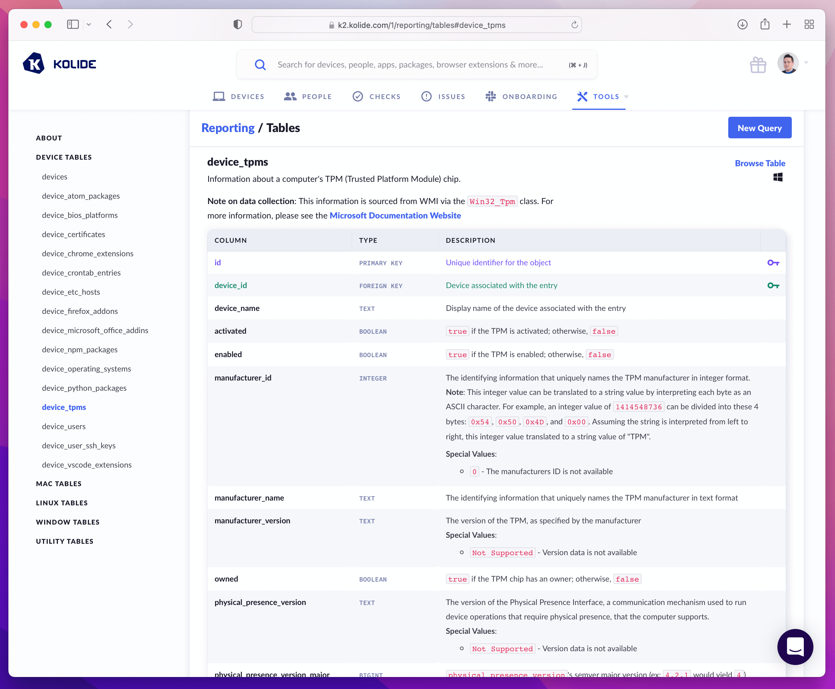 Kolide’s agent takes advantage of osquery’s tpm_info table, which enumerates