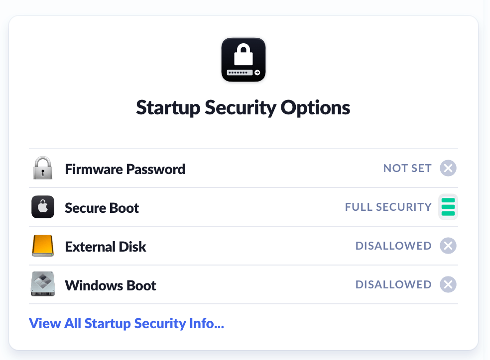 Have you ever wondered if a Mac had an EFI firmware password set or if Secure Boot has been turned off? Well, instead of wondering, you can now instantly look up the state of these options and other boot settings in our newly released device property in Inventory called Mac Startup Configuration.