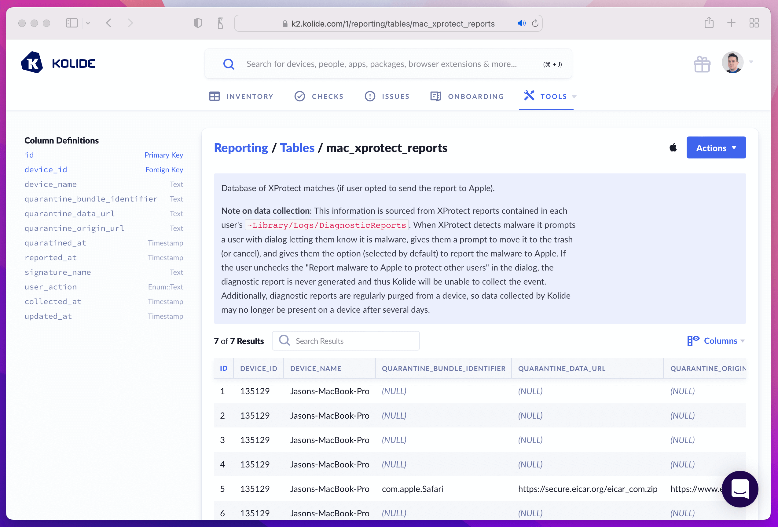 XProtect is the primary component of macOS’ built-in antivirus apparatus. It works with Gatekeeper to prevent users from executing known malicious binaries. Previously Kolide could enumerate XProtect’s configuration, including its internal version, the hash of the signature files, and when they were last updated.