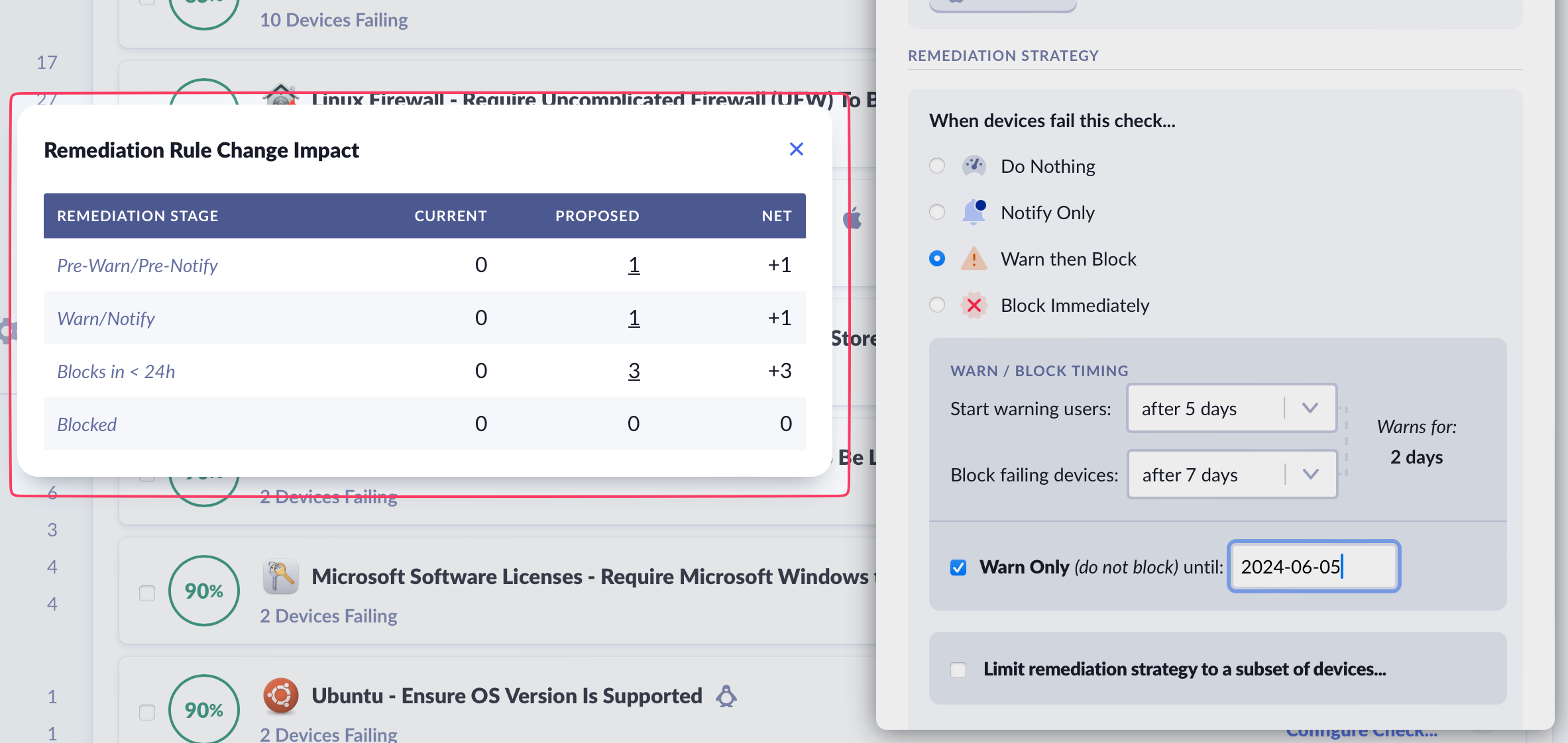 Finally, we’ve broken out the “Don’t Block Until…” settings so that they are always available to be set, in both the Block Immediately and the Warn and then Block strategies. Previously, this setting was only conditionally shown when we believed a remediation strategy change you made might result in blocking devices right away, now with this new impact preview, we can keep this setting available at all times.