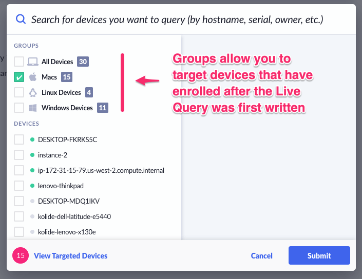 When you run queries continuously, it is very important to be able to select devices by their platform so that newly enrolled devices will be targeted by the query in future runs.