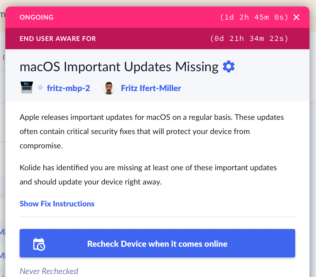 Today, when a device fails a Check, Kolide immediately schedules a Slack message to be sent to an end-user during their next notification window (the next weekday afternoon in their local time).