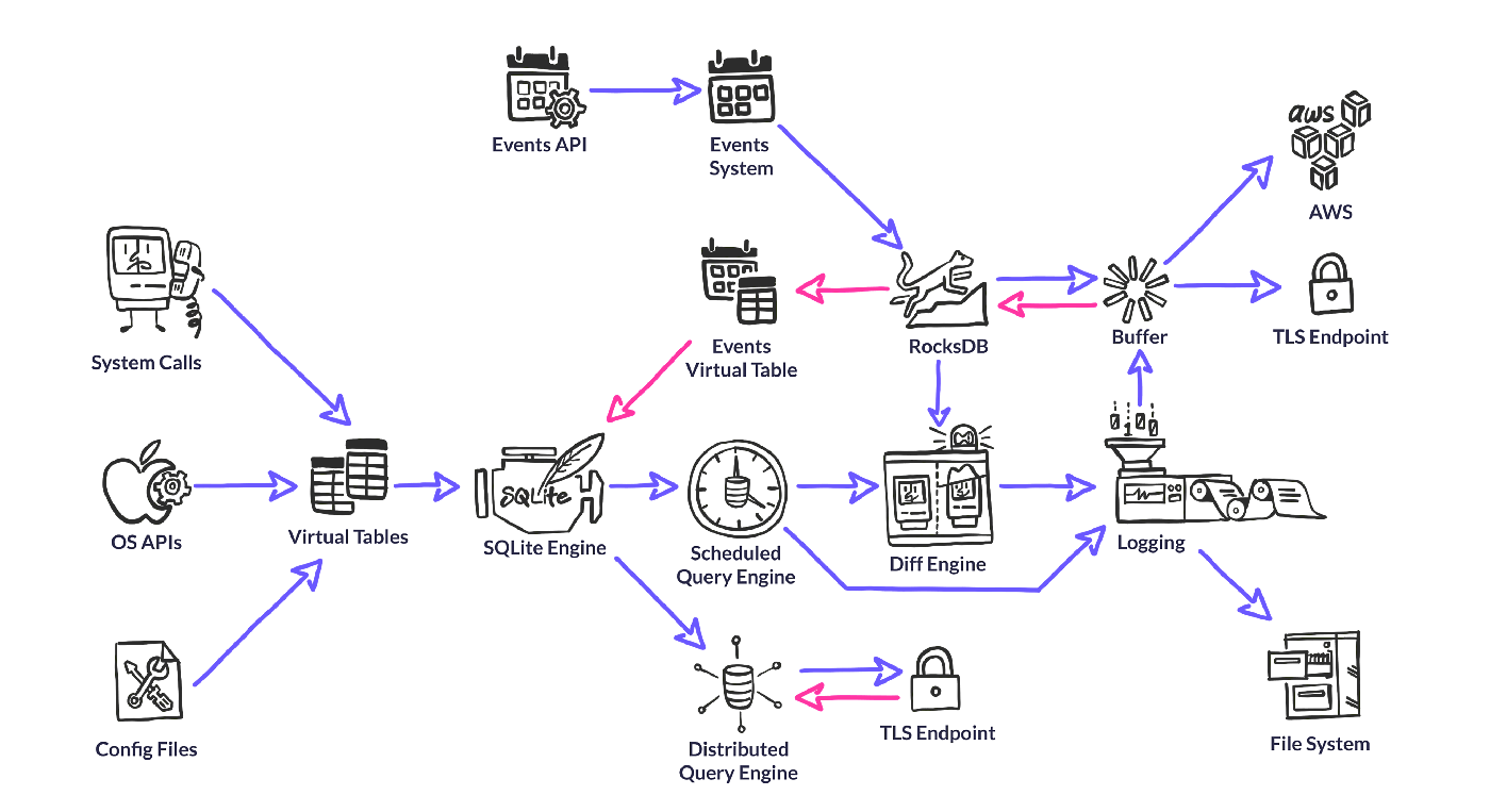 It’s important to mention that, while osquery uses the SQLite query engine, it does not actually use SQLite for data storage. Most data is generated on-the-fly at query execution time through a concept we call “Virtual Tables”. Osquery does need to store some data on the host, and for this it uses an embedded RocksDB database (discussed later).
