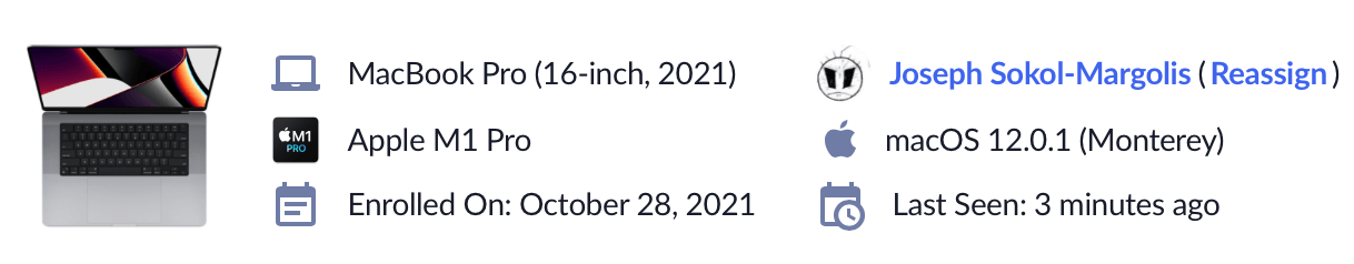 These new MacBook Pros feature two variants of the M1 CPU, the M1 Pro and the M1 Max. Previously, Kolide did not feature the true name of the CPU in our Device overview page; but now, we not only have the correct name for the chip, we also show you the logo!