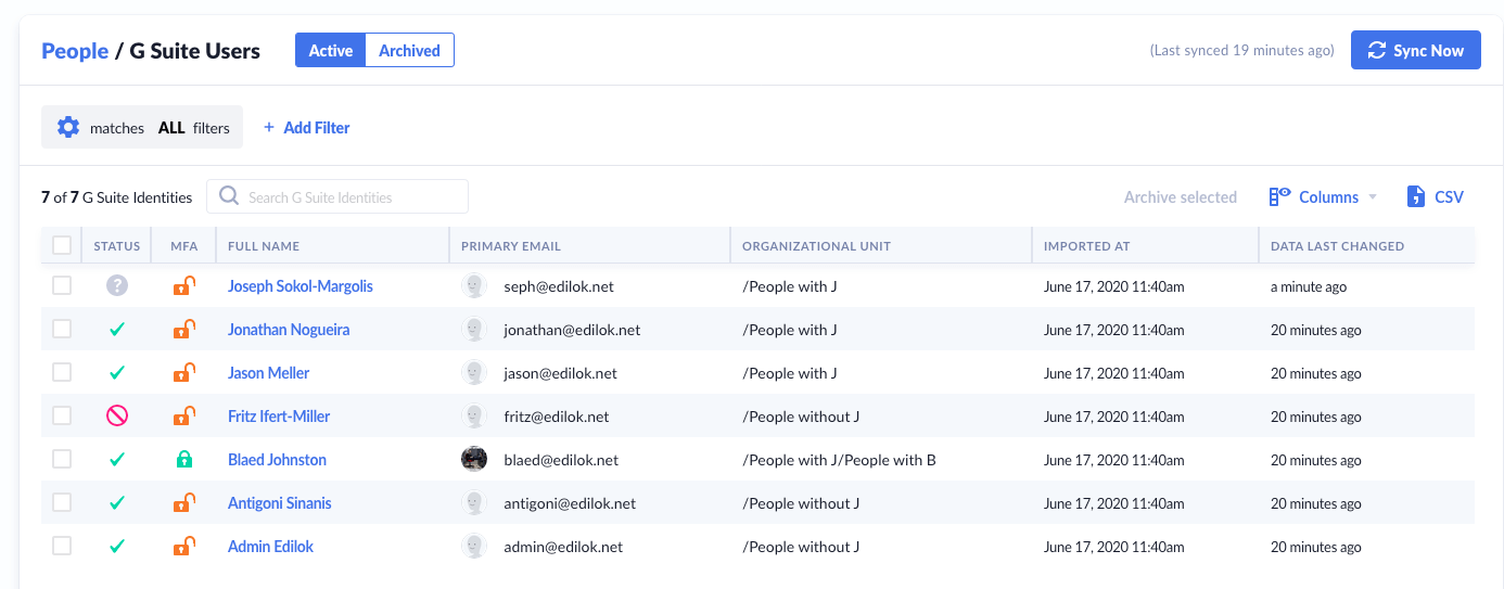 If you already integrate your G Suite account with Kolide, you know we keep track of those accounts in Inventory. When an account is deleted, instead of archiving it on our end, we mark it as missing. Sometimes though, G Suite accounts are not deleted, merely suspended. Kolide now can differentiate between an active account, a suspended account, and a missing account, which we display in the “Status” column in the table of G Suite identities.