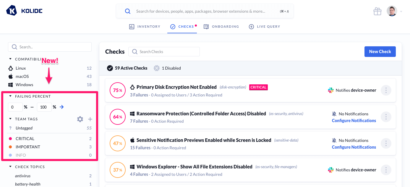 After shipping our new Check page filtering experience and Check tagging, we’ve received a lot of great feedback from many of you that it would be nice to be able to filter Checks that have no assigned tags, or filter Checks by their failing percentage.