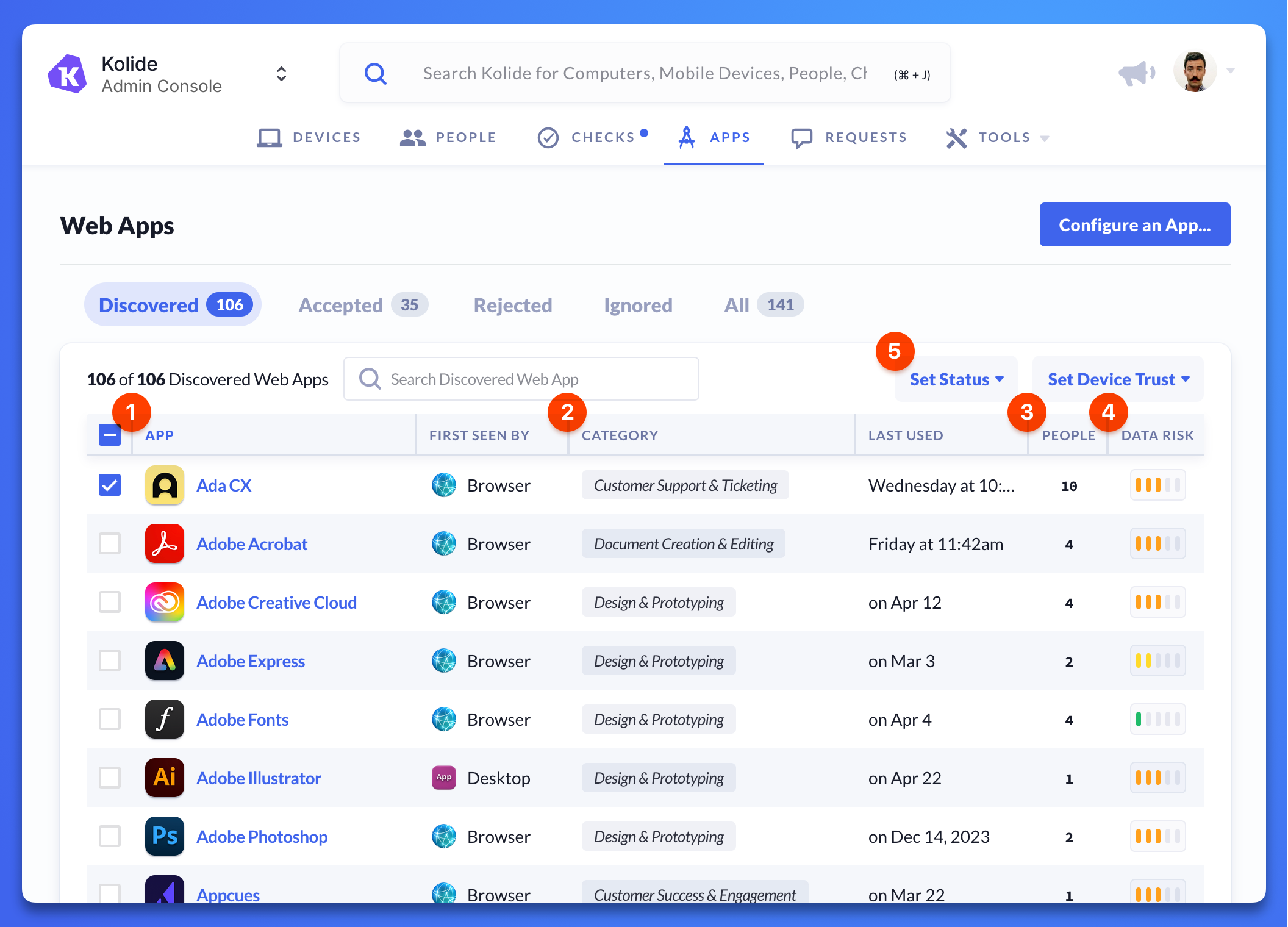 - ⚪ Discovered: Web apps your team members are using that match Kolide’s pre-defined list of business-related apps. You can review discovered apps and choose if you want to protect them with Device Trust. (Only apps with discovered usage can be set to this status.)