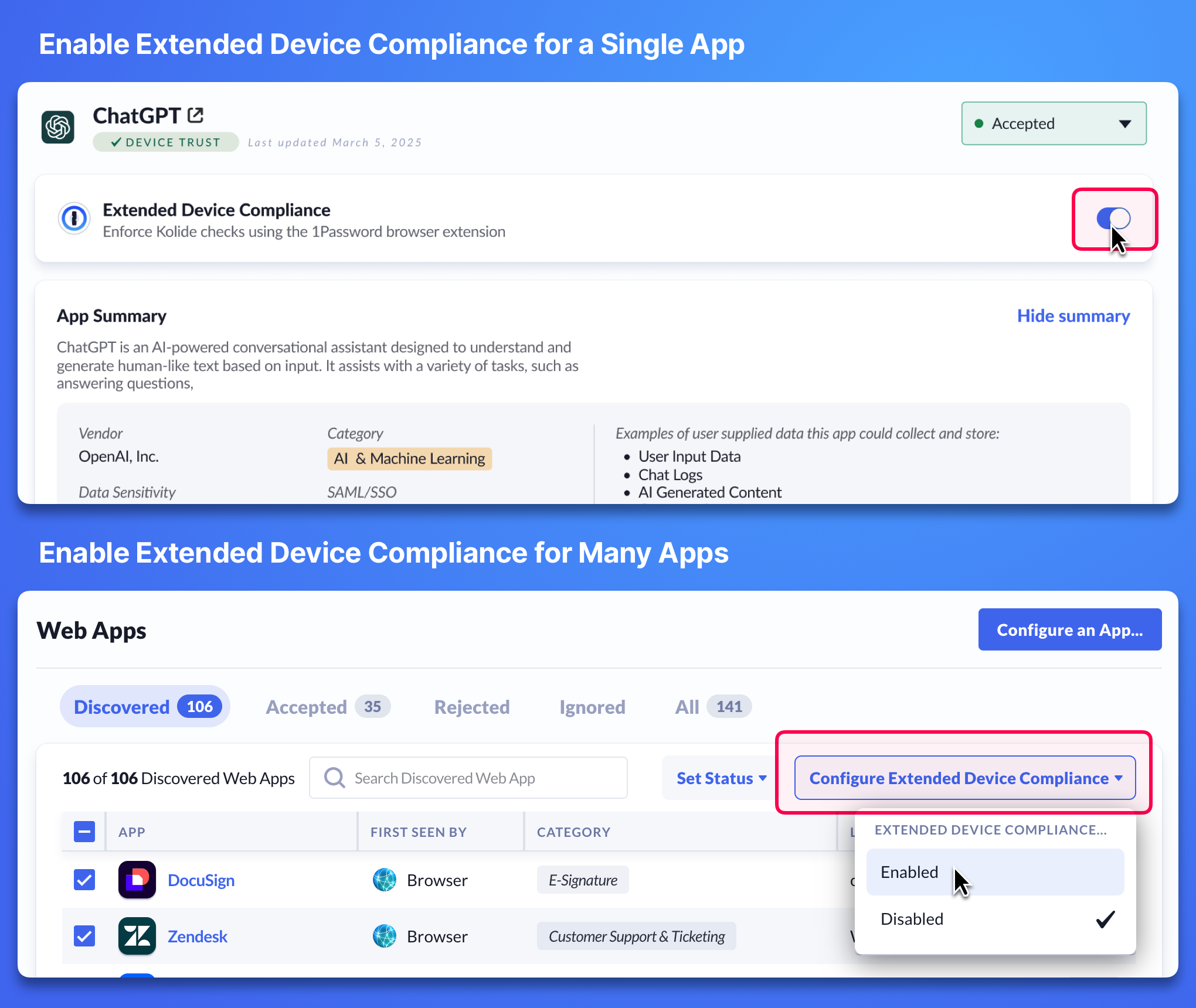 Extended Device Compliance can be enabled for a single app, or for multiple apps at a time.