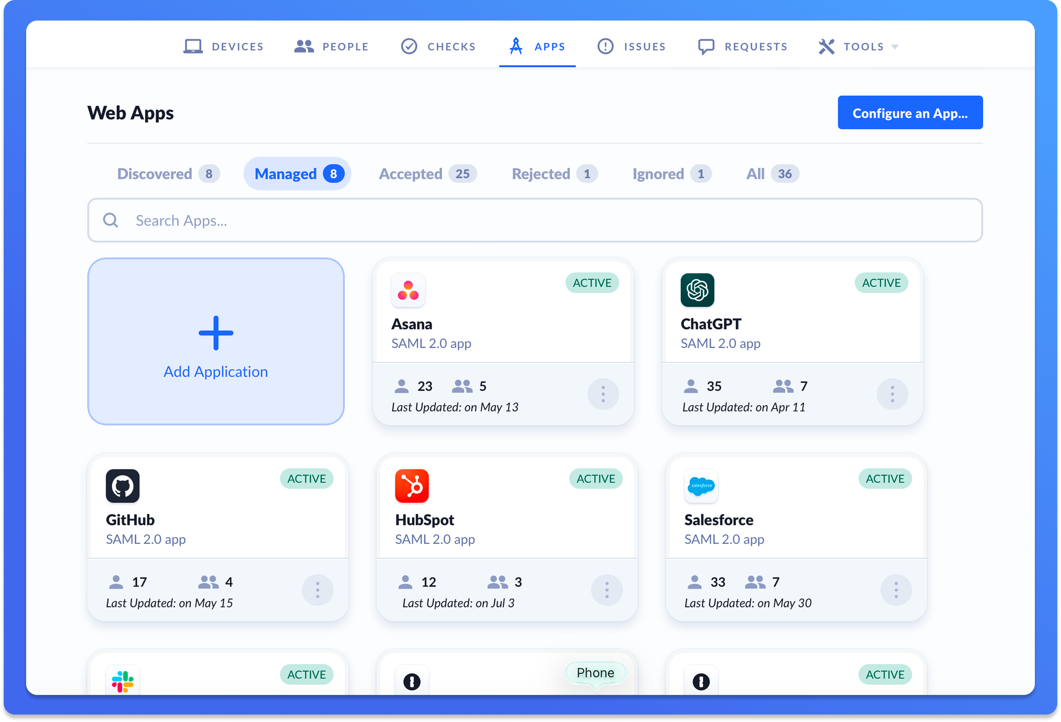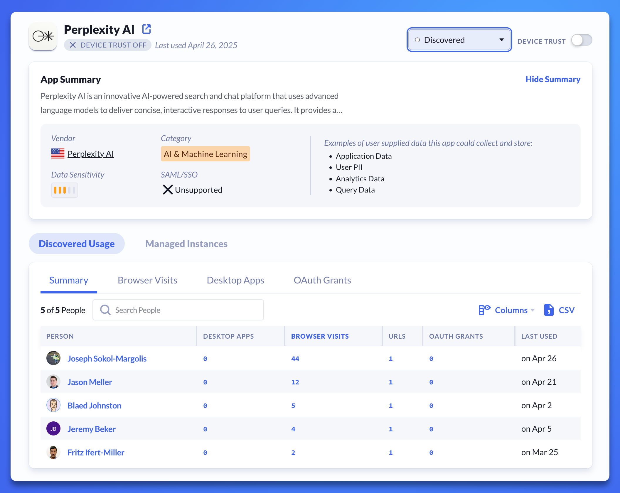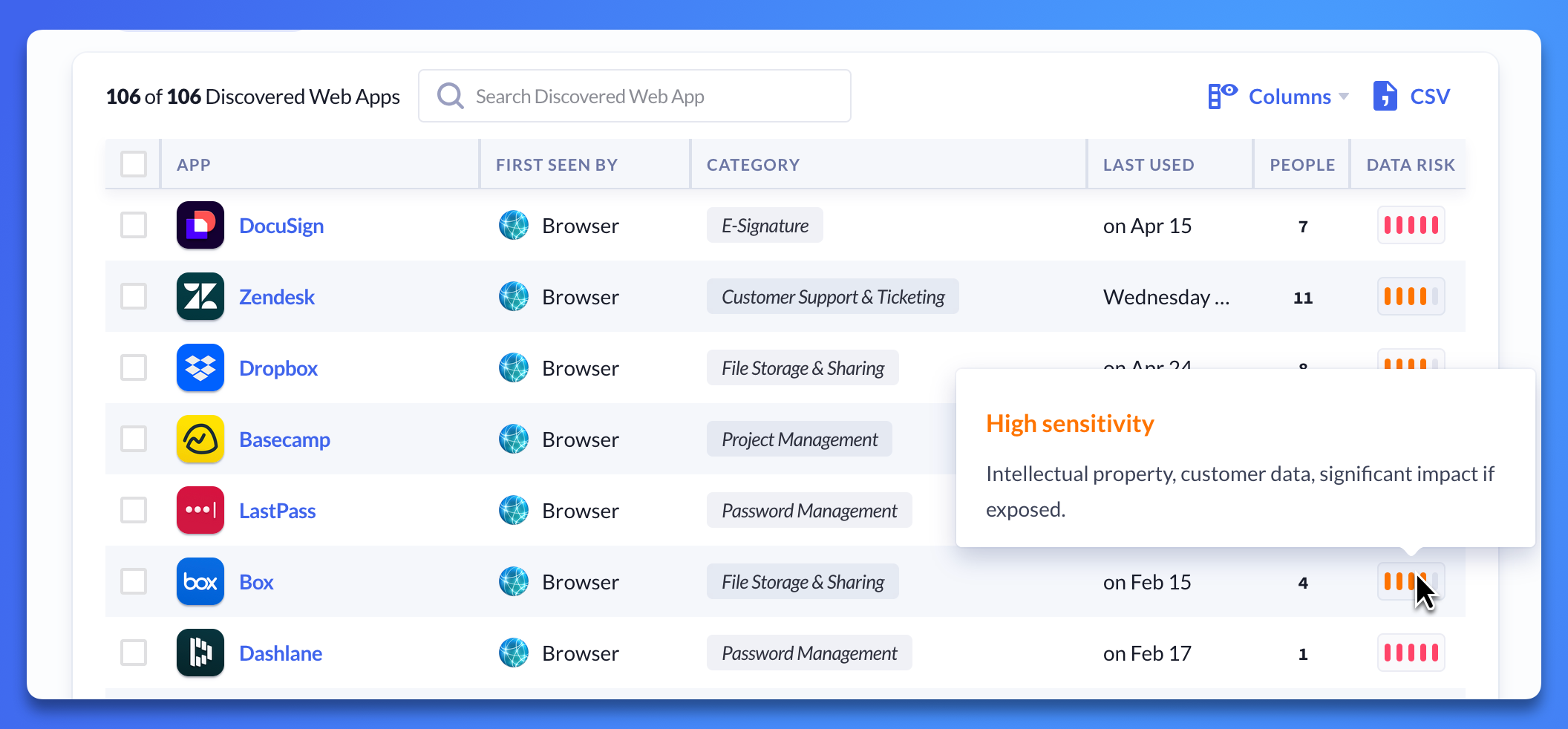 App Discovery aggregates data from usage sources such as browser activity and desktop app installations to identify which web apps employees commonly use and where company data may be stored.
