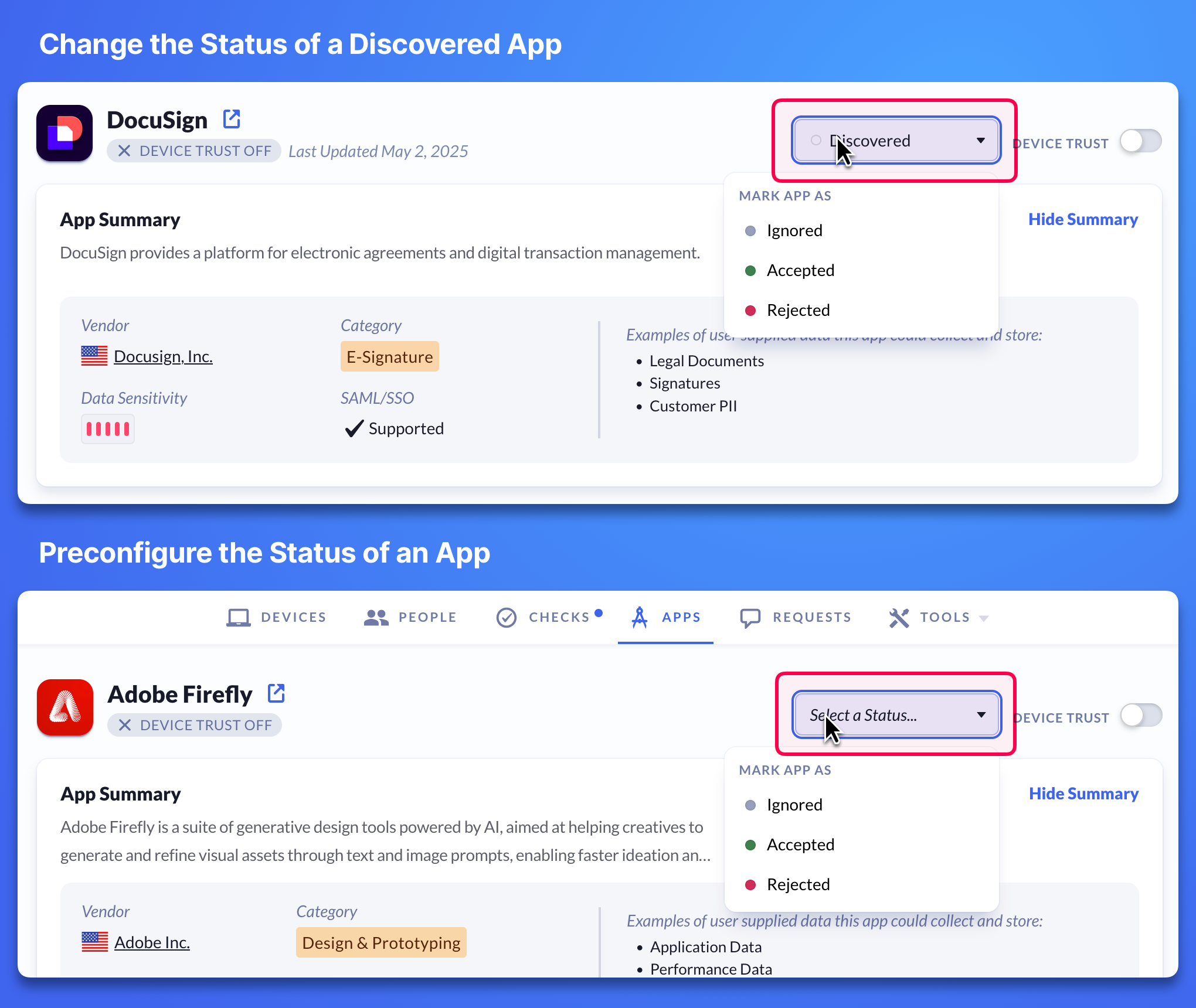 - 🟢 Accepted: When you turn on Device Trust for an app, it will be automatically marked Accepted. Marking an app Accepted does not automatically turn on Device Trust.