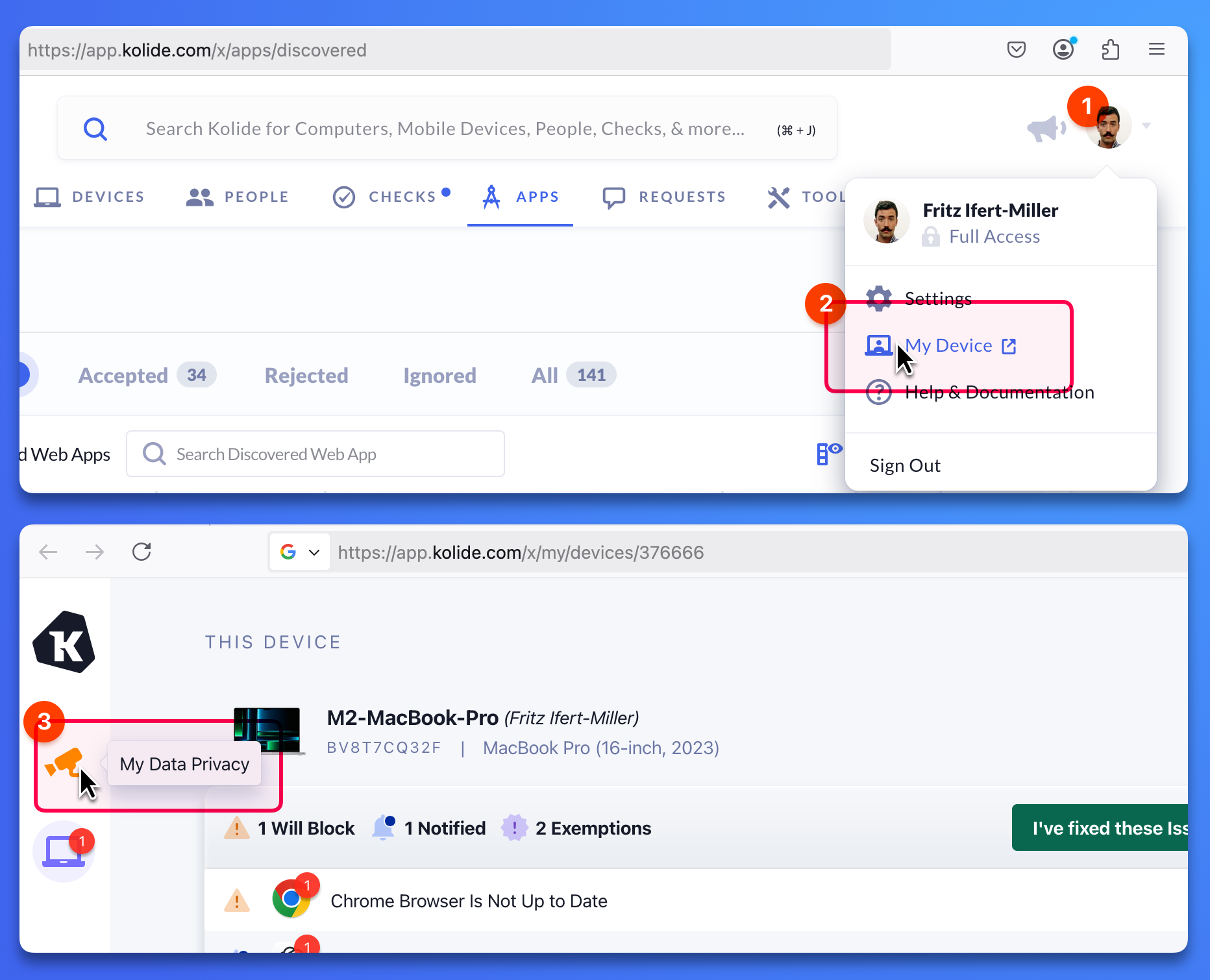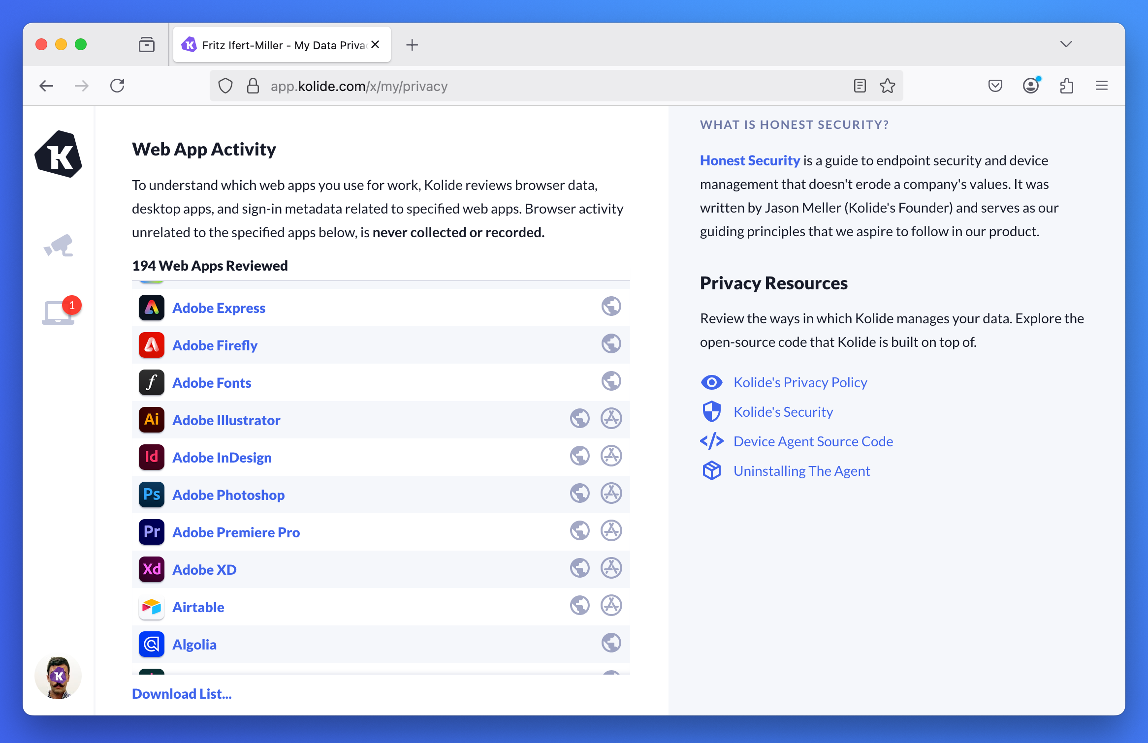 To access the Privacy Center, select your profile in the top-right corner of Kolide, then select My Device. Next, select the security camera icon. You can also follow the link below: