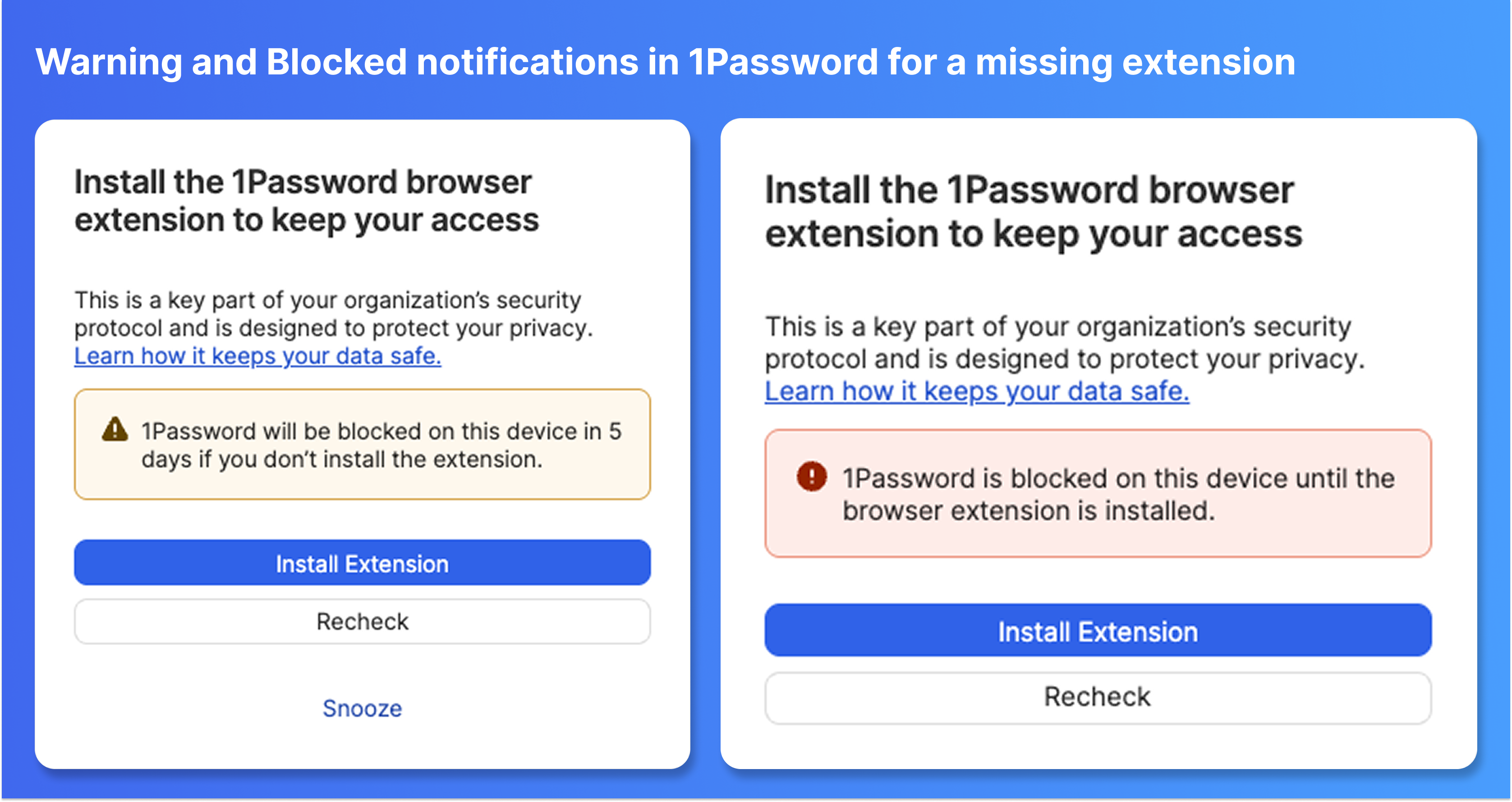 When you turn on the Check, anyone who doesn’t have the 1Password browser extension installed or enabled will see a notification that they need to install it within a set grace period or they’ll lose access to 1Password.