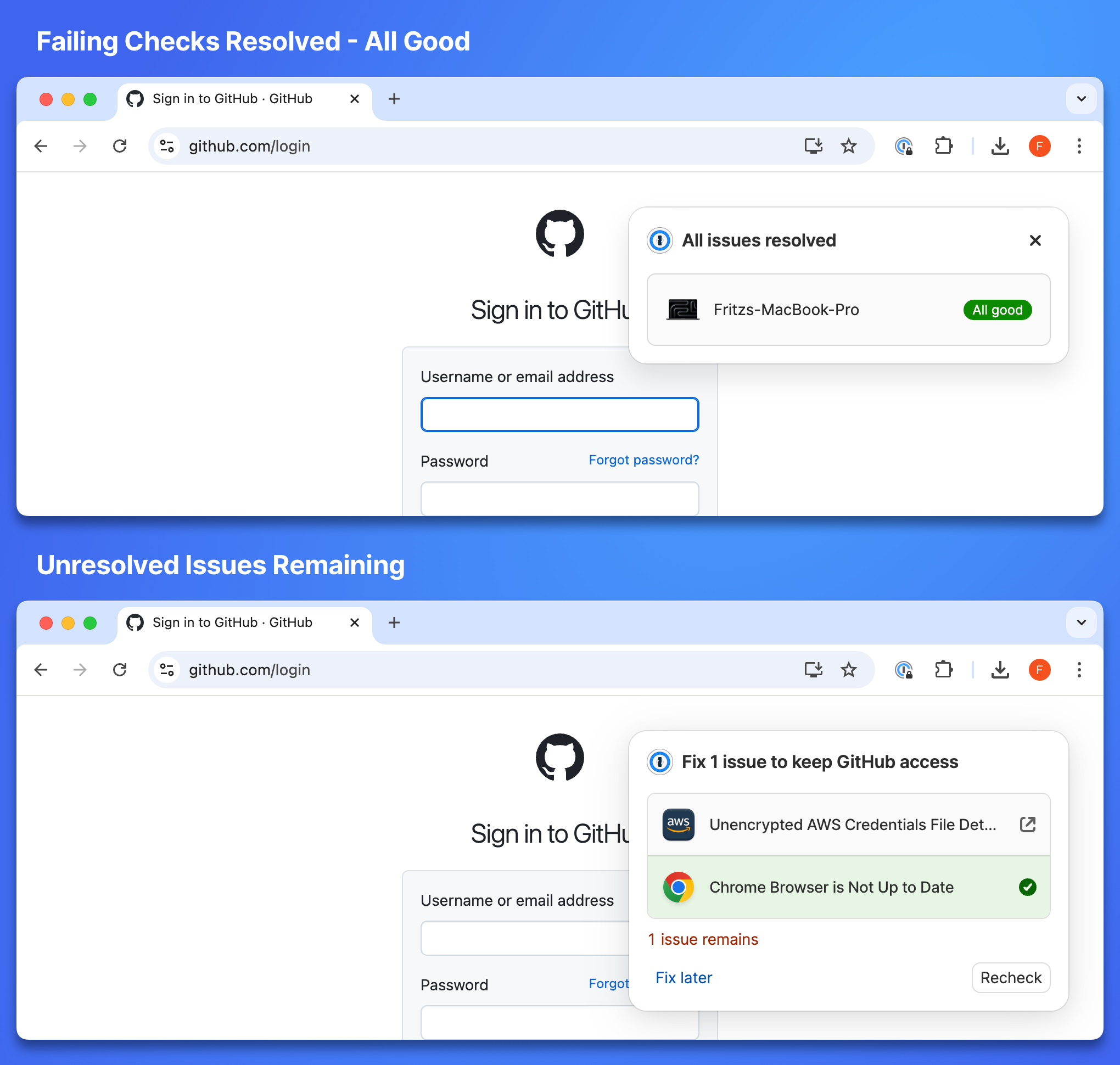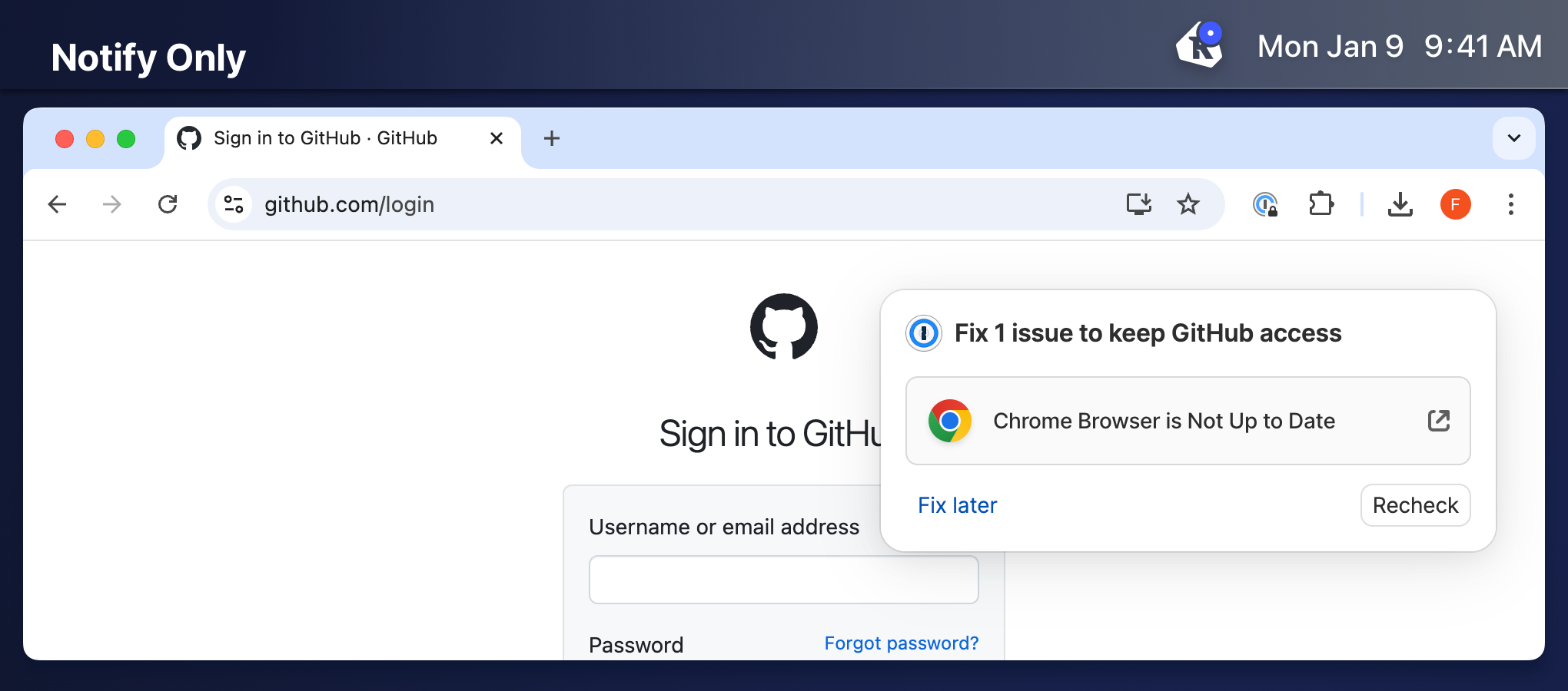 Notify Only - The 1Password browser extension shows a pop-over notification in the top right of the active tab informing the end user that they have an issue with their device. The user can still see and interact with the webpage underneath the pop-over. The user can defer the notification without fixing the failing Check by selecting the button labeled Fix later.