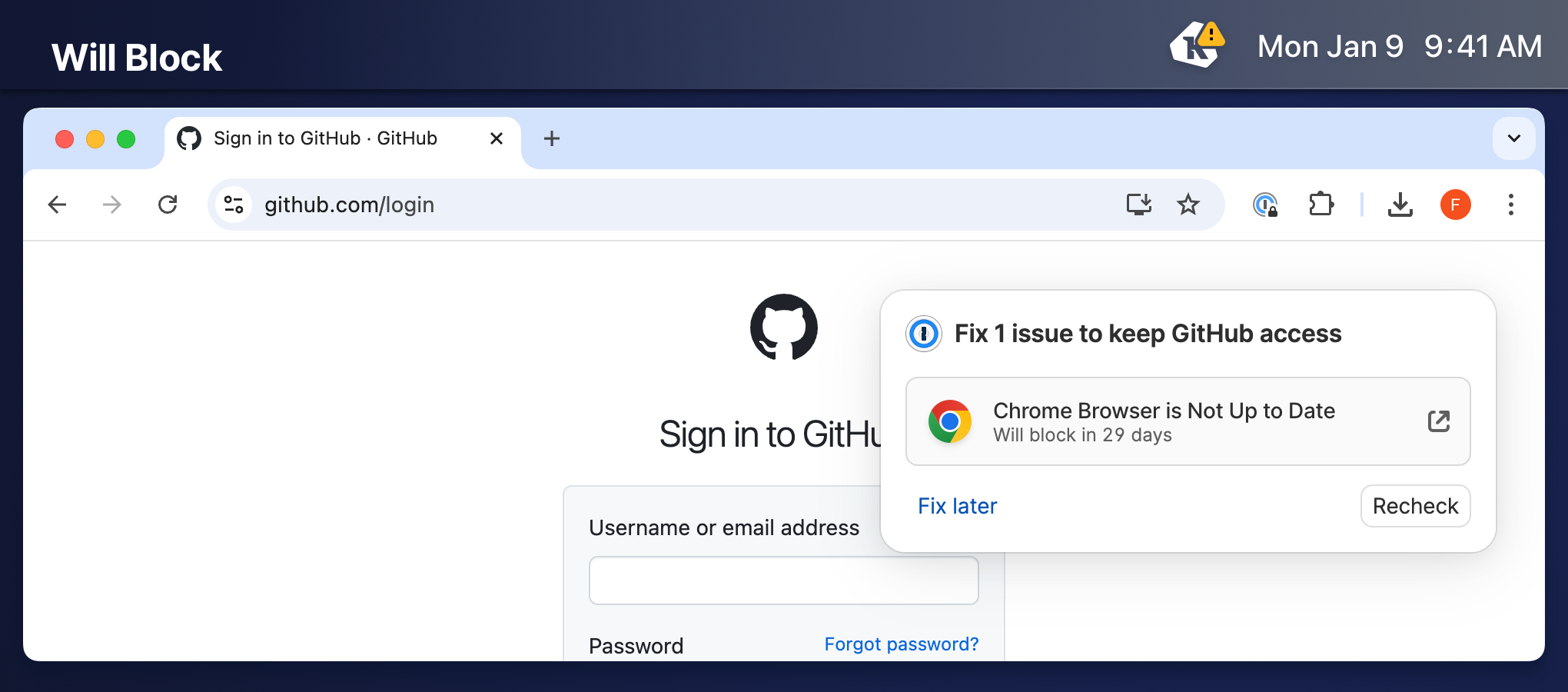 Will Block - The 1Password browser extension shows a pop-over notification in the top right of the active tab informing the end user that their device will be blocked in