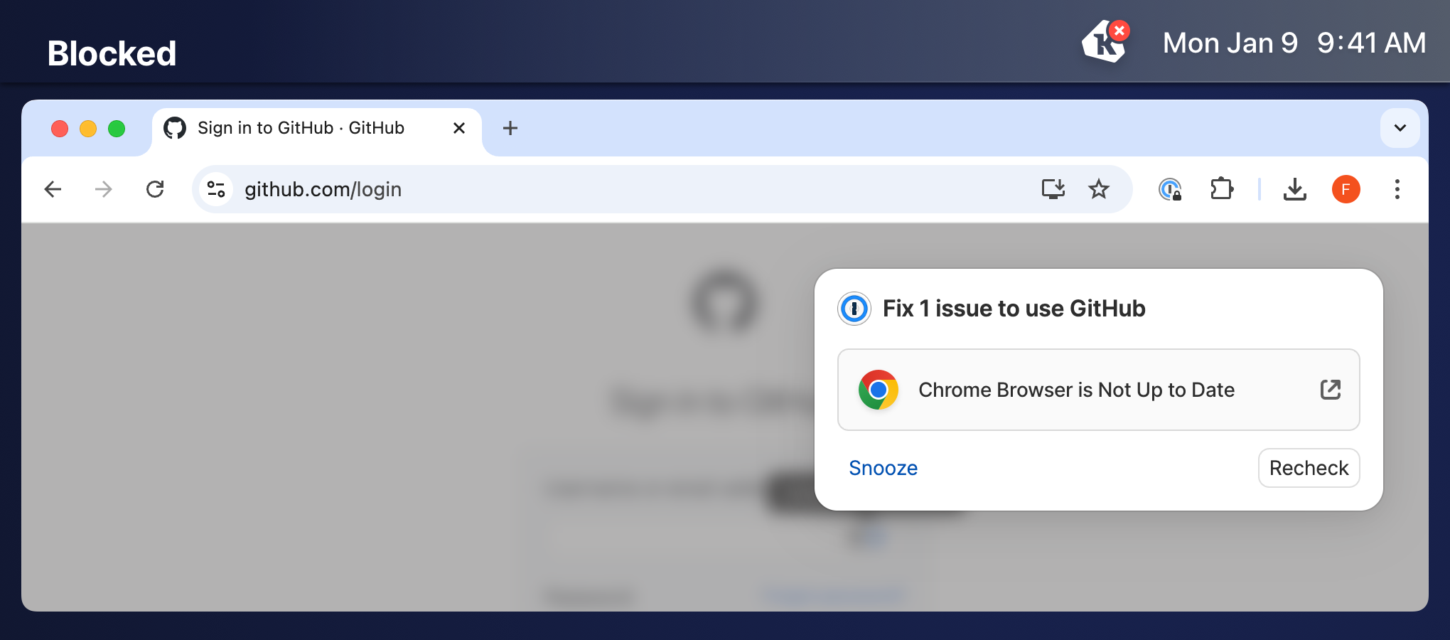 Blocked - The 1Password browser extension obscures the webpage with a blur overlay and shows a pop-over notification in the top right of the active tab informing the user that they cannot access the web app until they fix their failing device Checks.