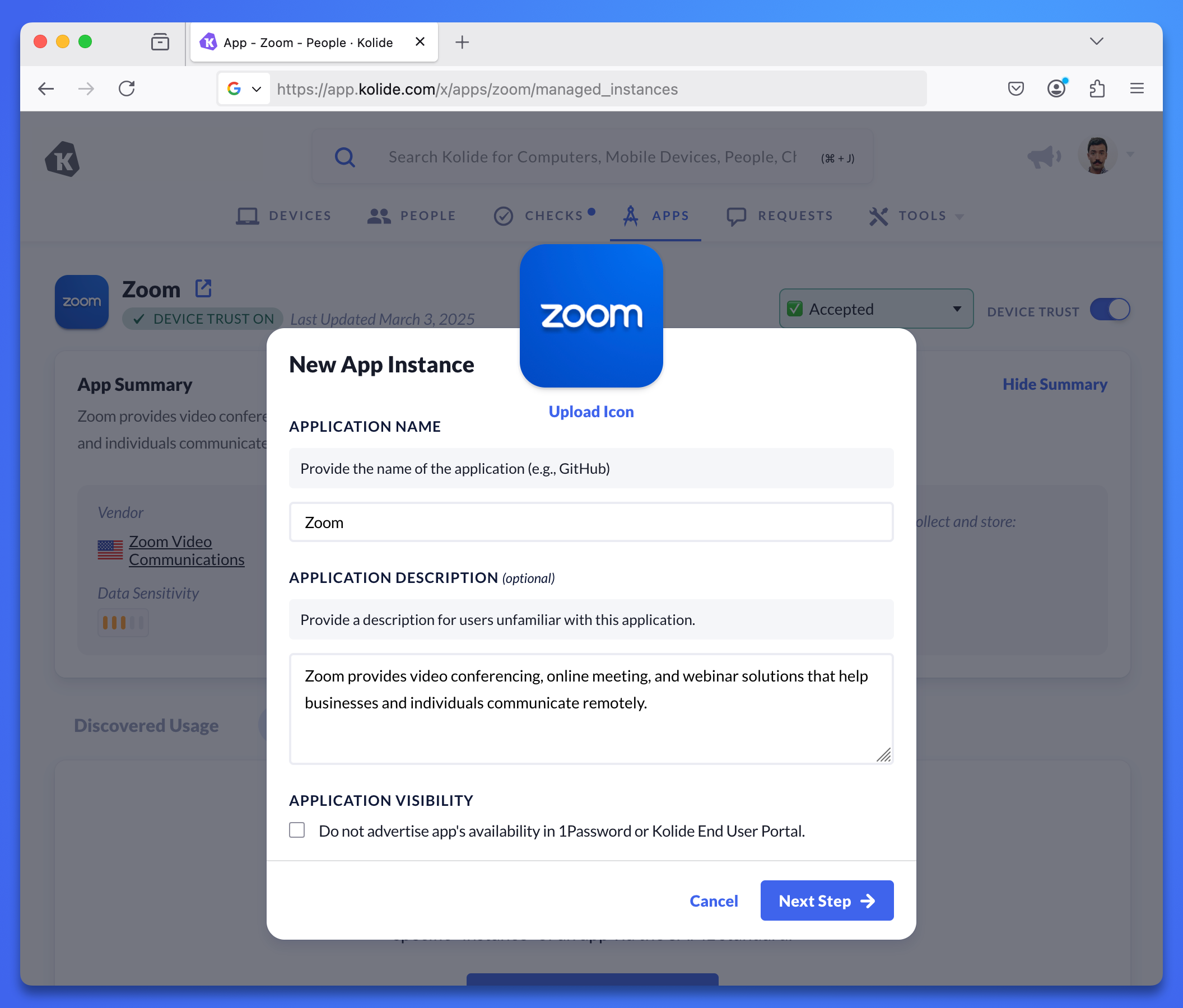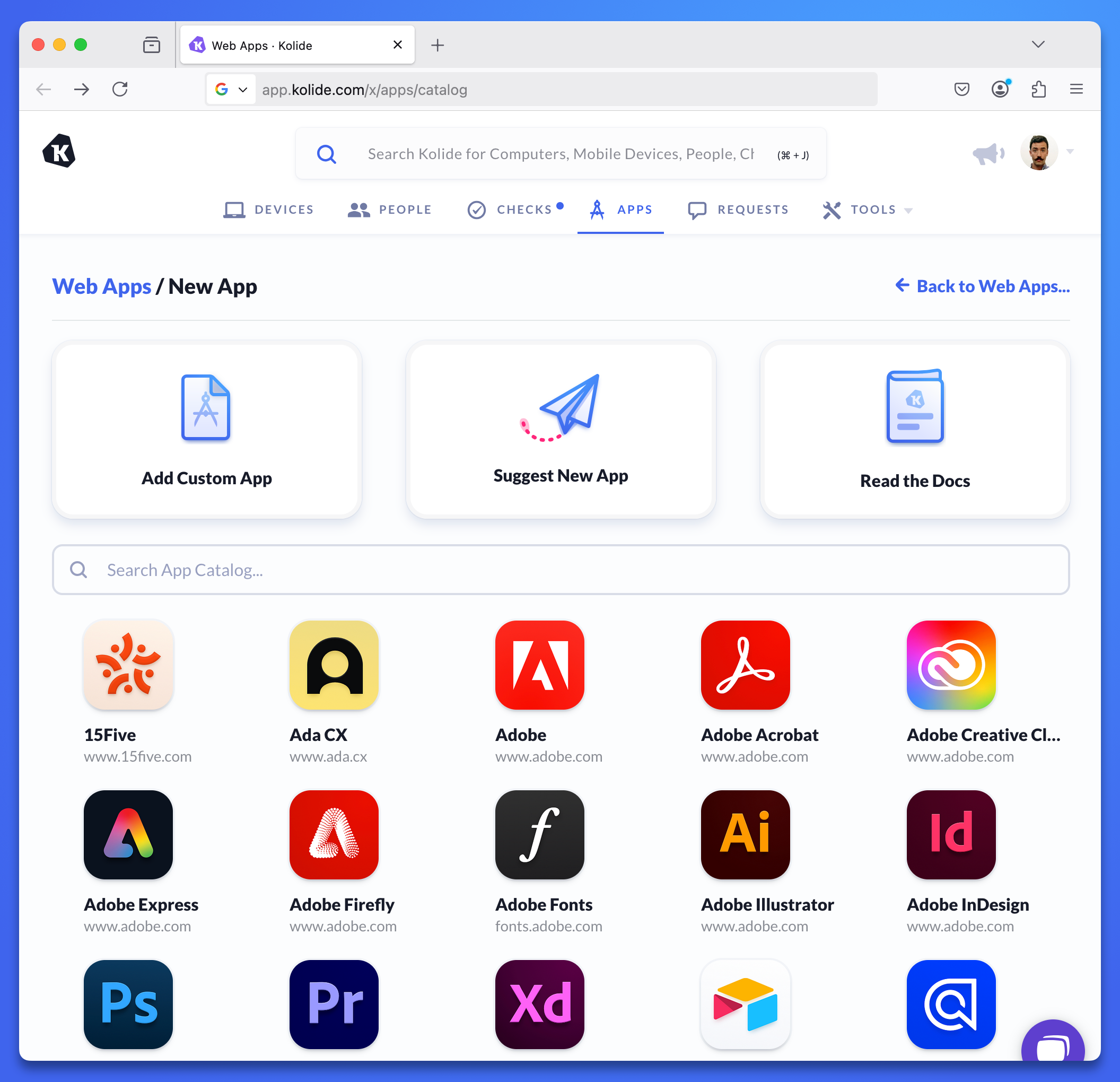 - In Kolide, select Apps in the top navigation.