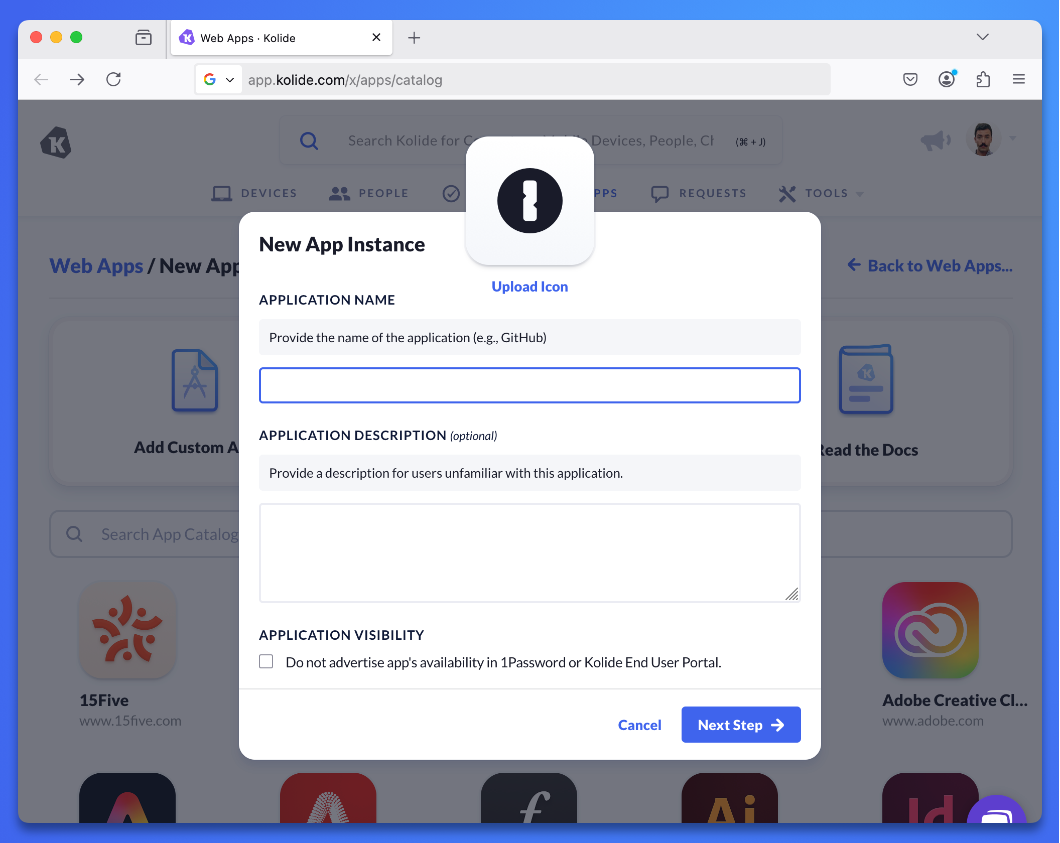 - Choose whether you want the application to be visible in the 1Password browser extension app launcher or the Kolide End User Portal.
