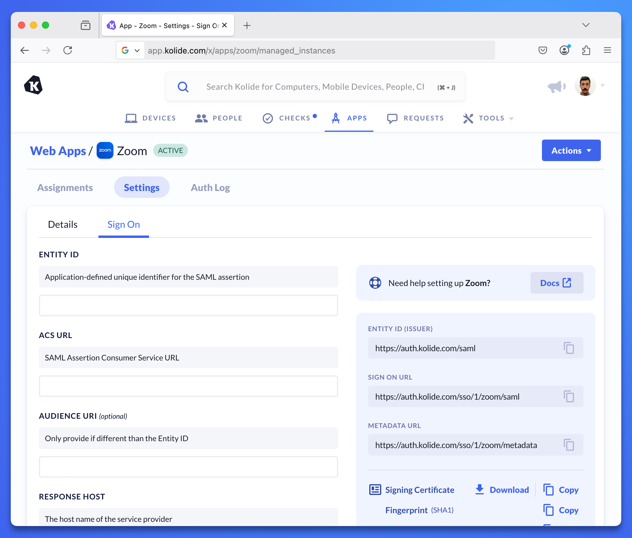 - Copy the Signing Certificate from Kolide and paste it into the Signing Certificate field in your app.