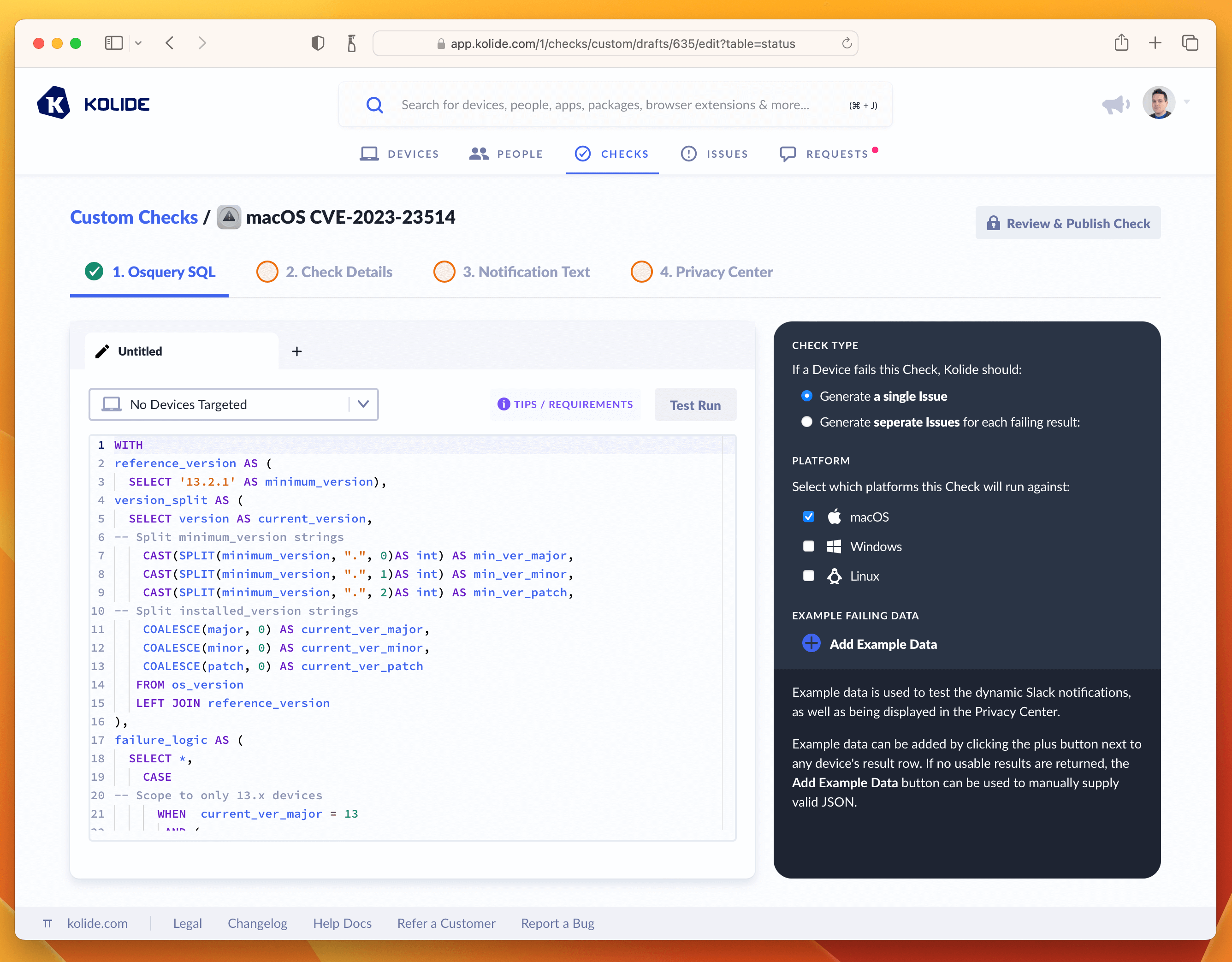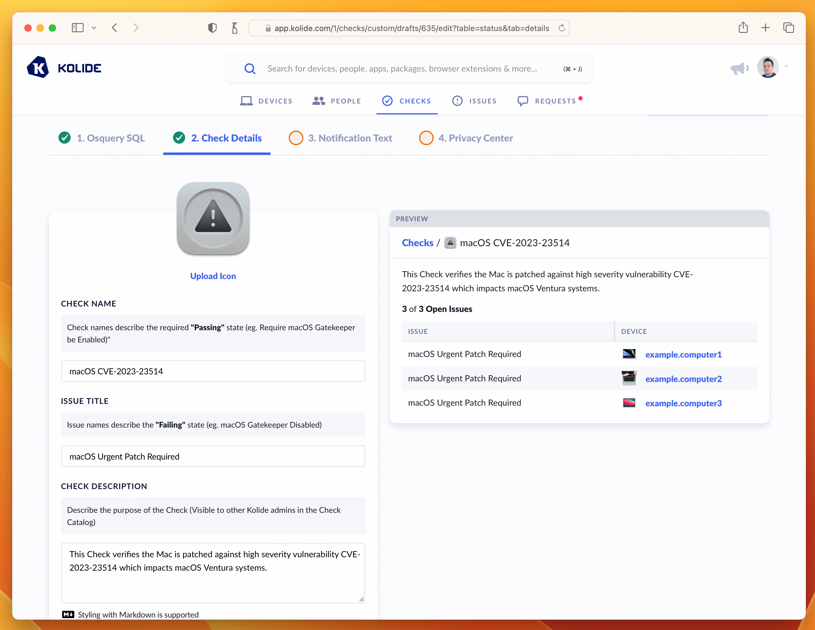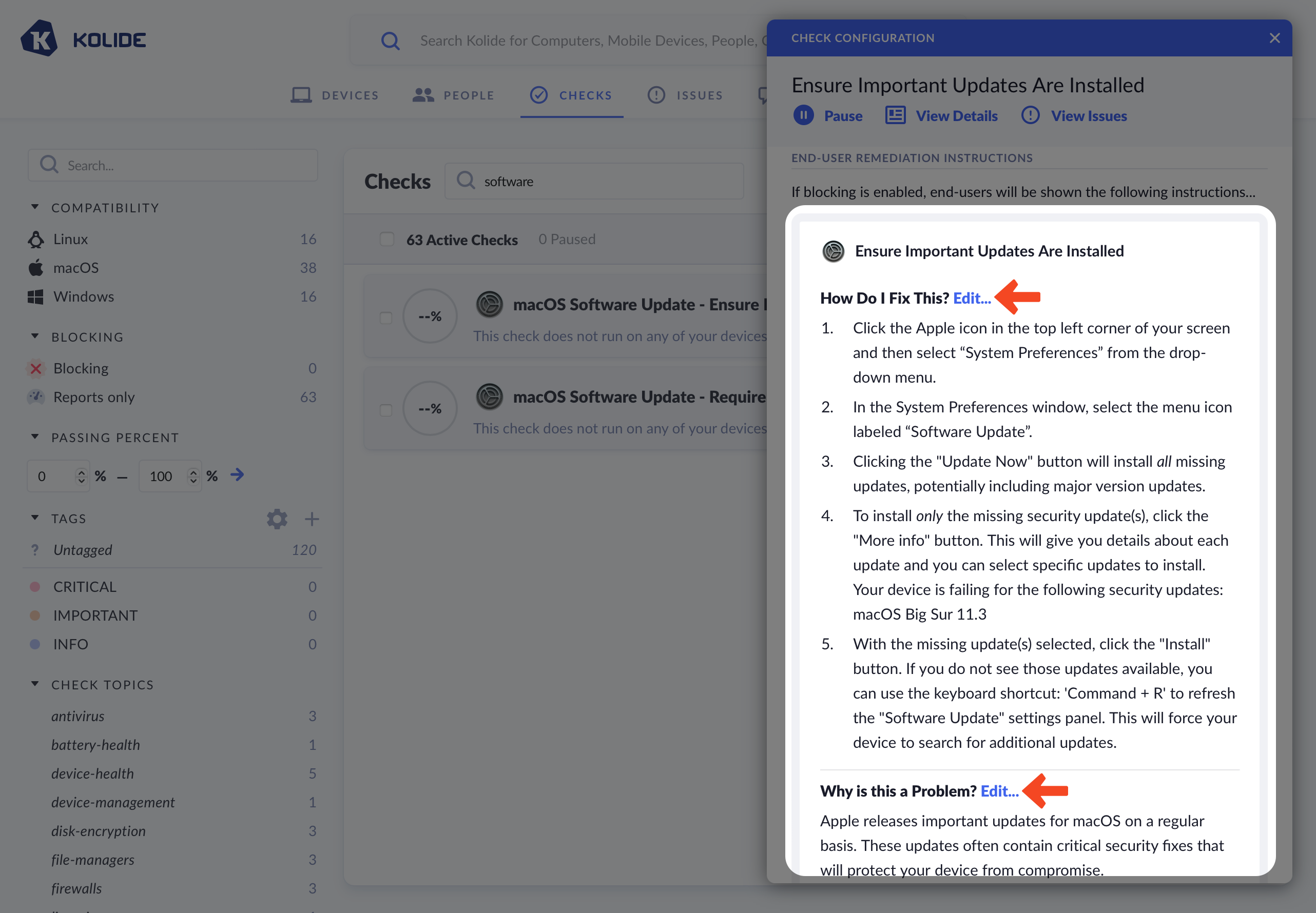 Kolide has flexible customization options that let administrators tailor how Checks operate and provide guidance to end-users.