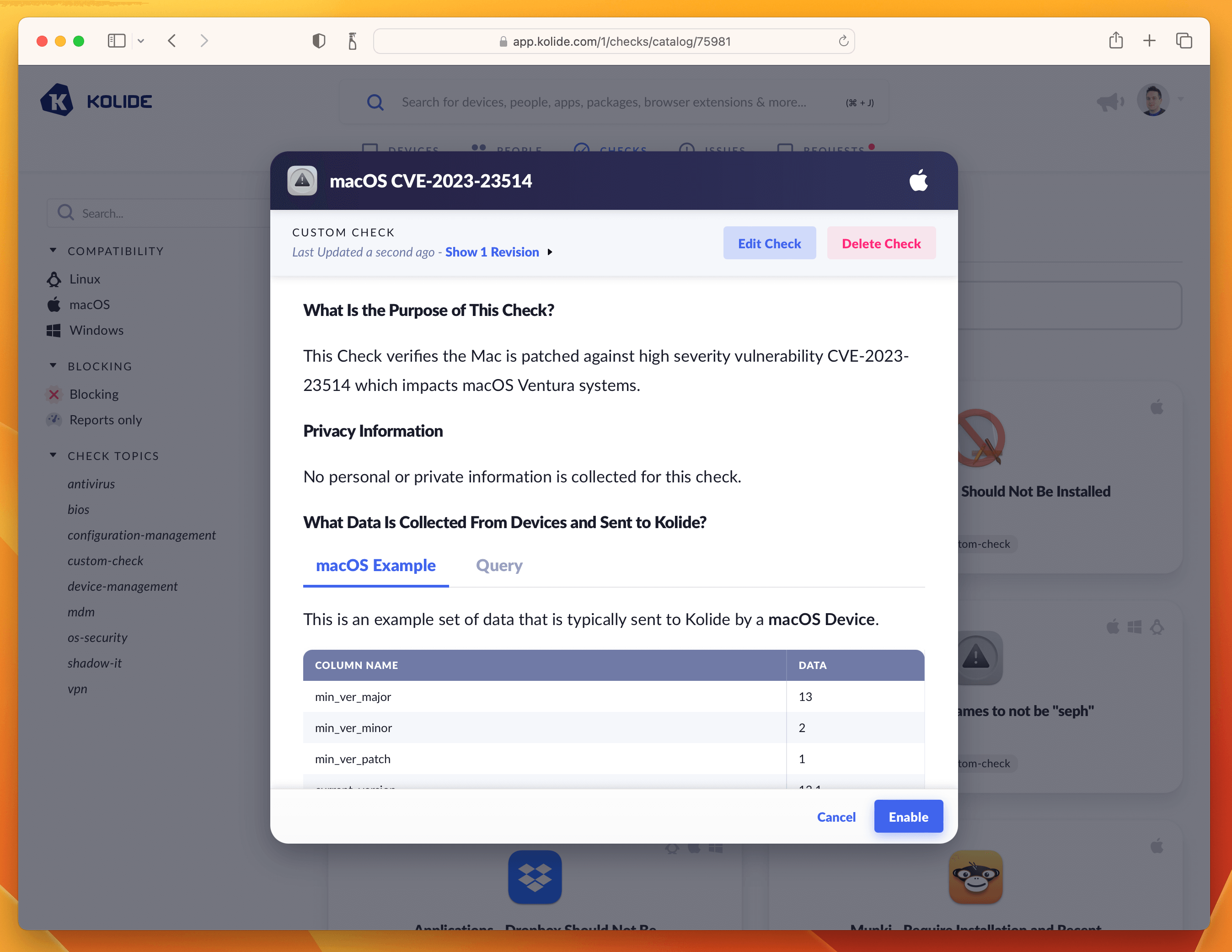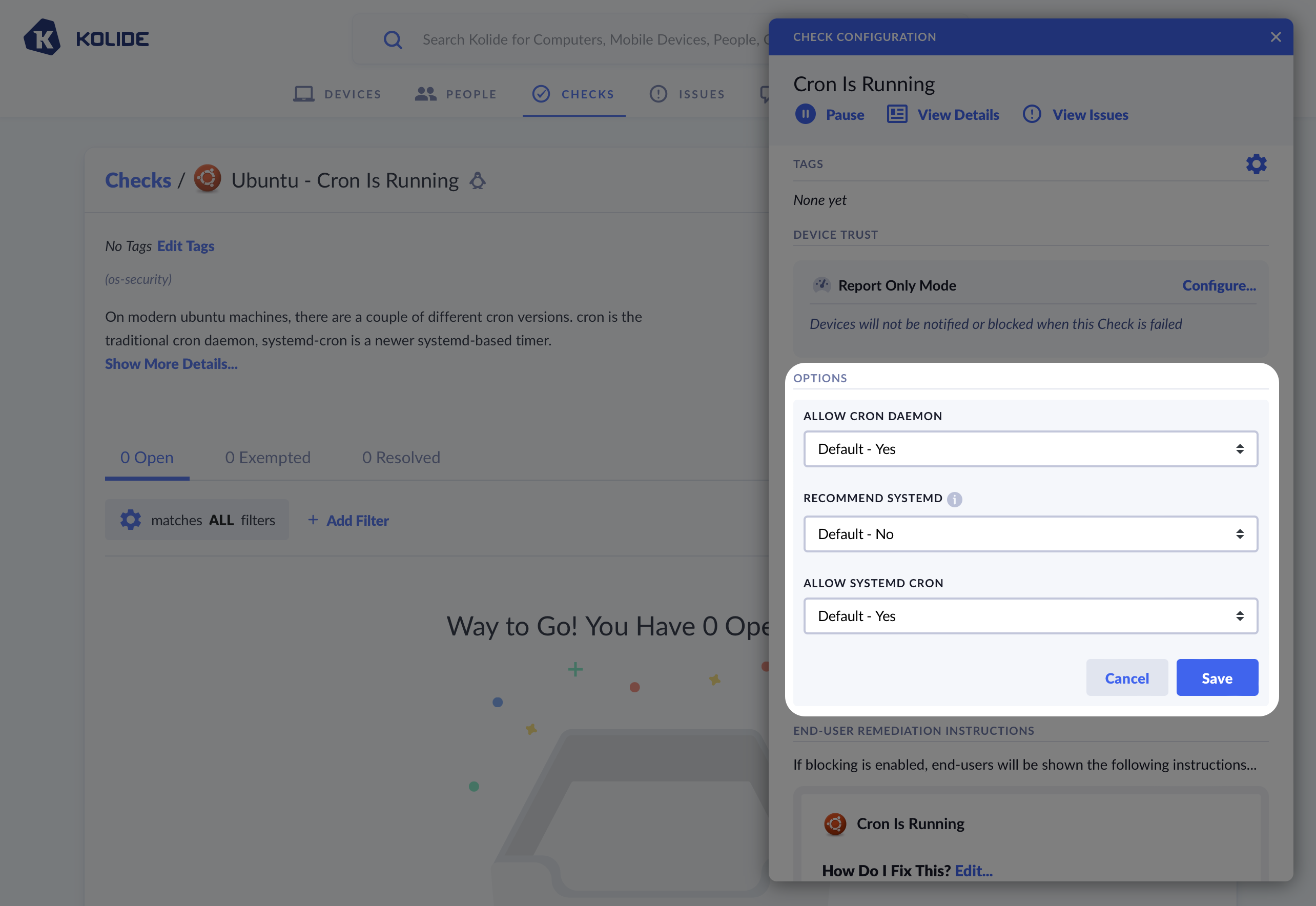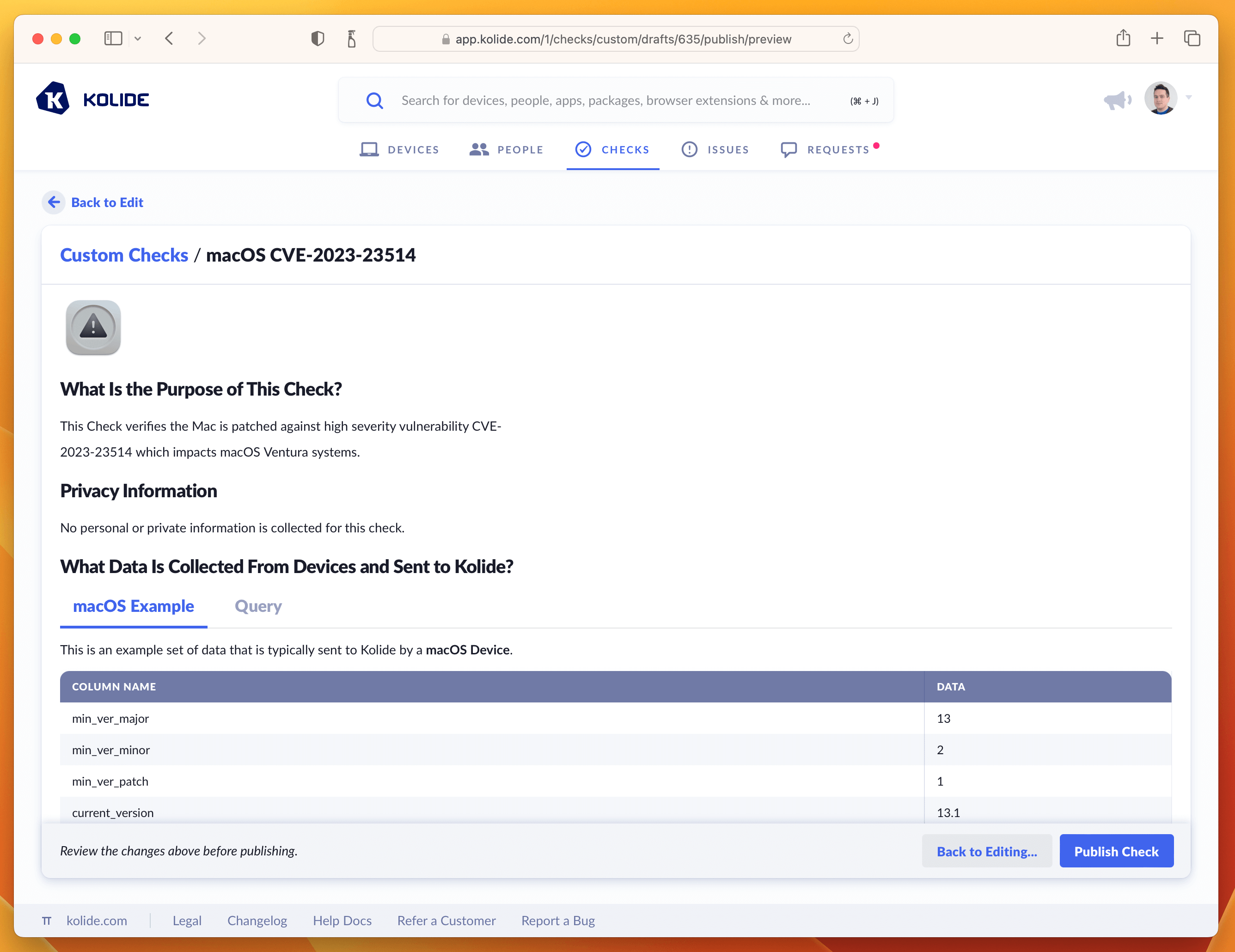 Kolide has flexible customization options that let administrators tailor how Checks operate and provide guidance to end-users.