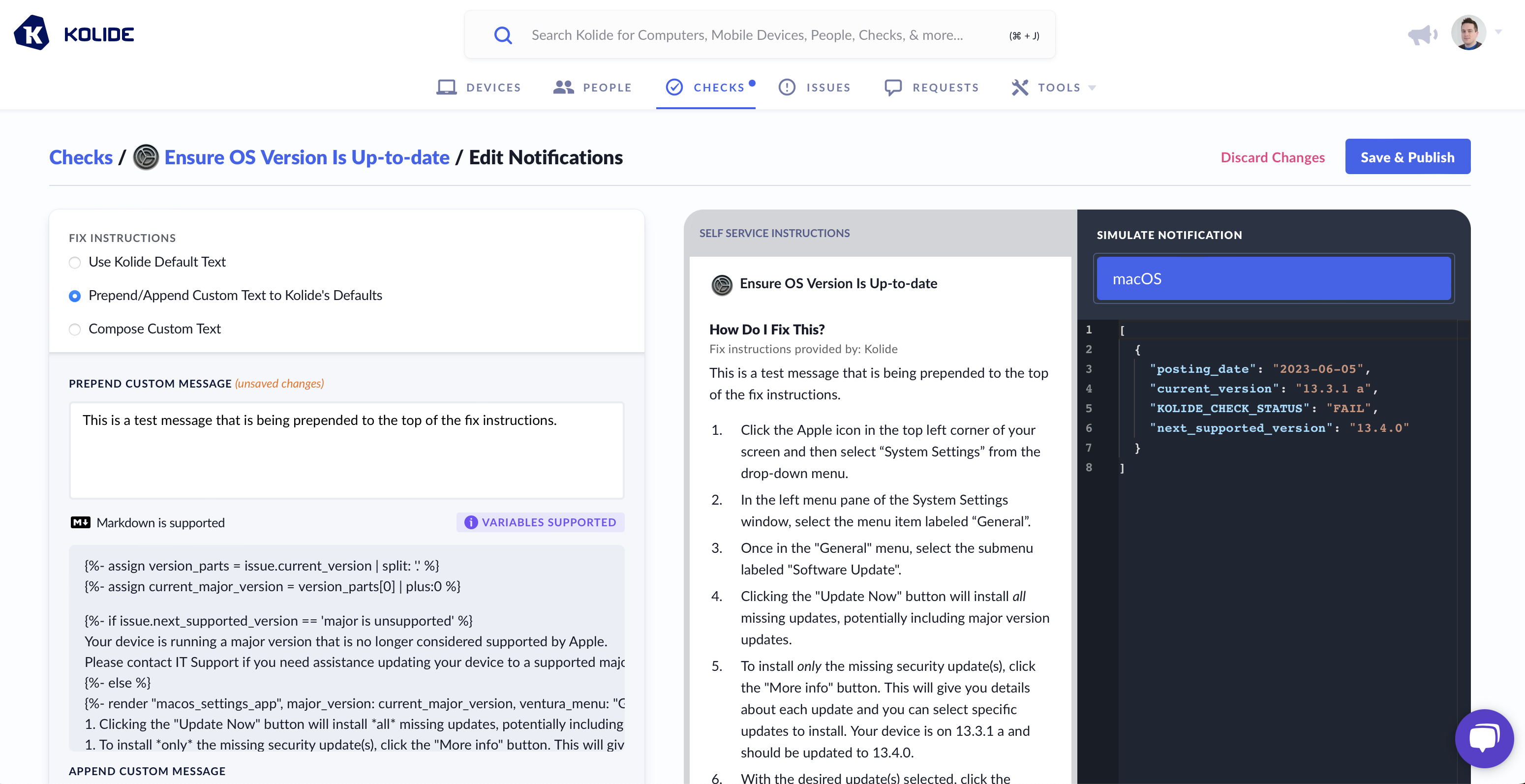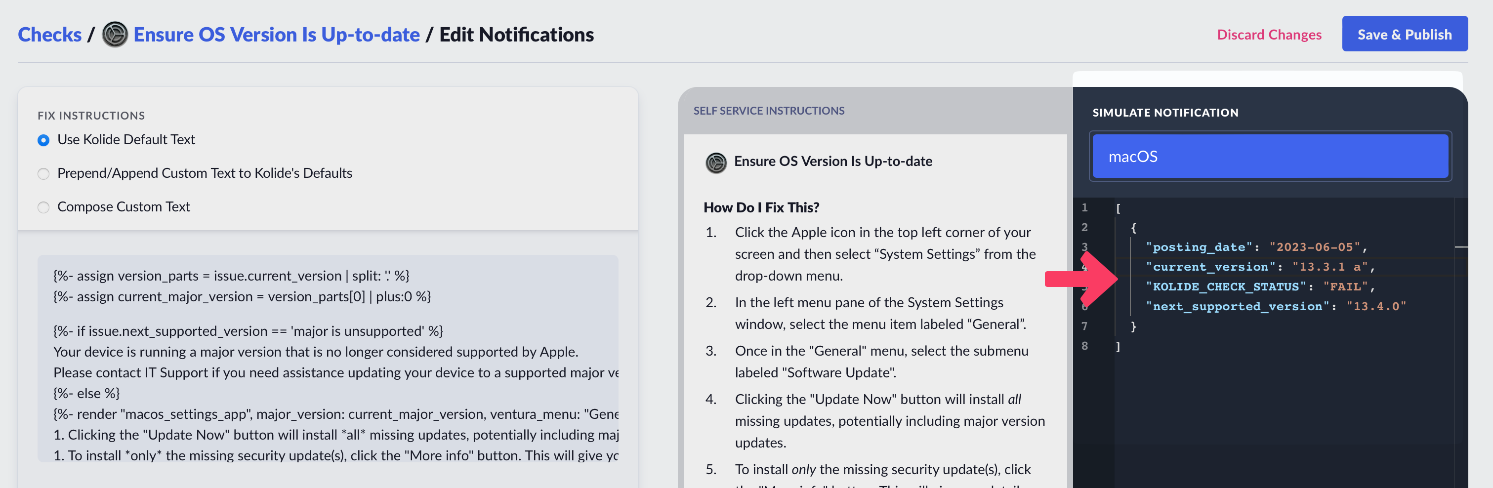 As shown above, when using Liquid, you can alter the instructions Kolide sends to the end-user based on the data from a failing check. To ensure your template functions correctly, utilize the Simulate Notification sidebar to modify the check data used in rendering the preview.