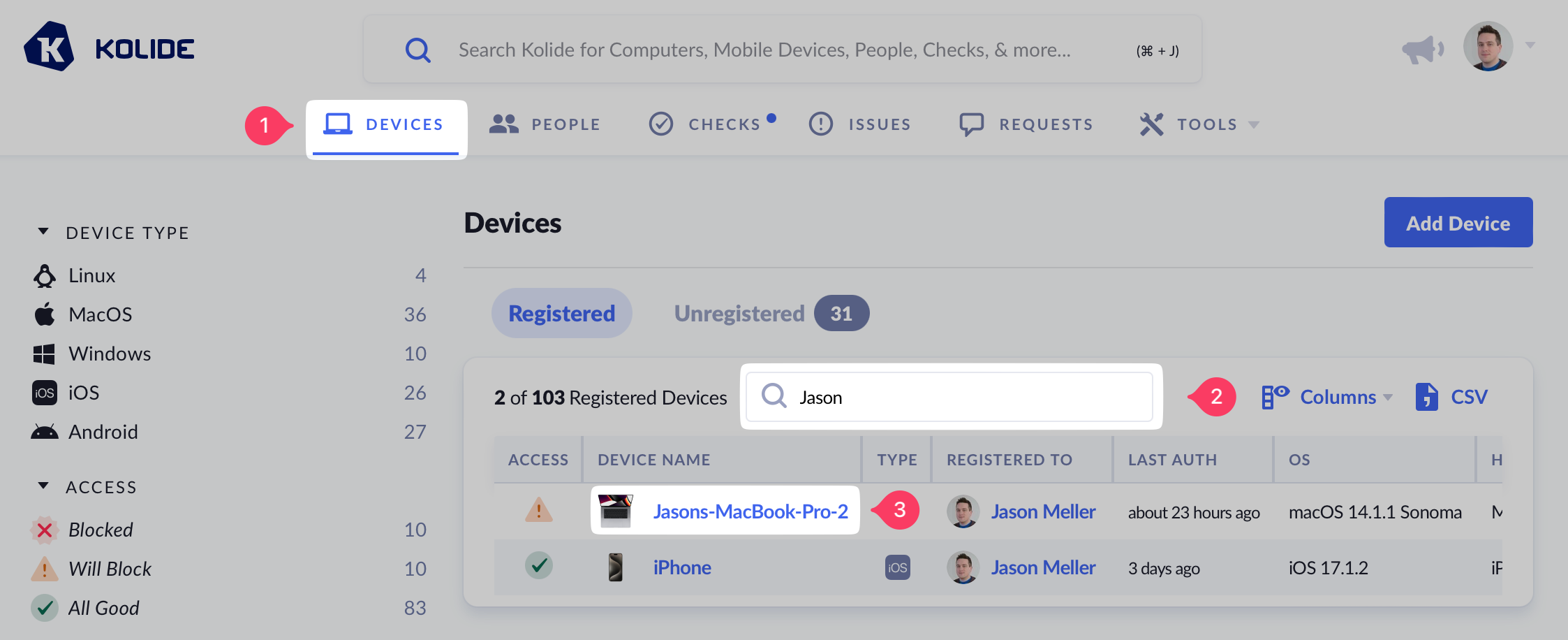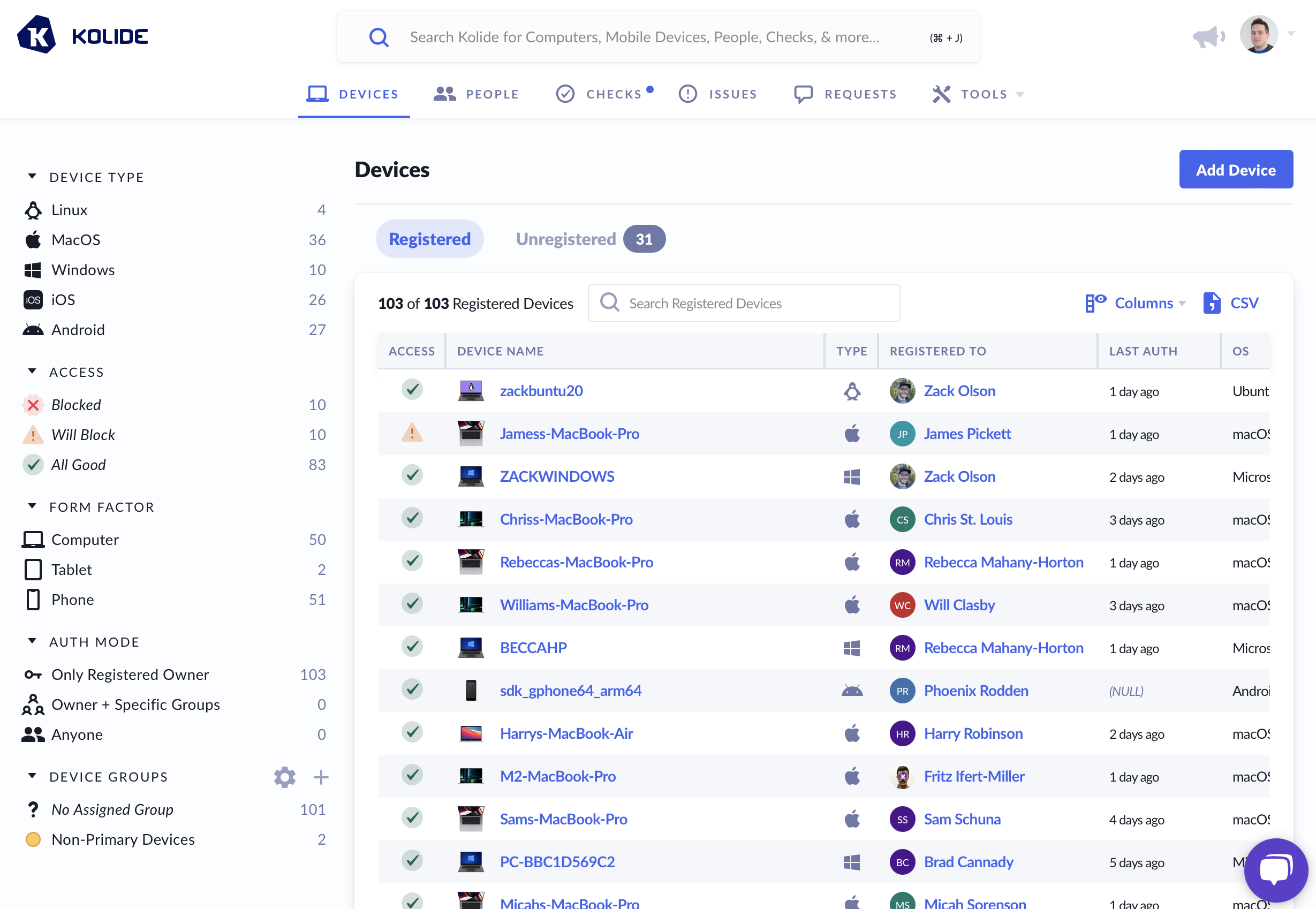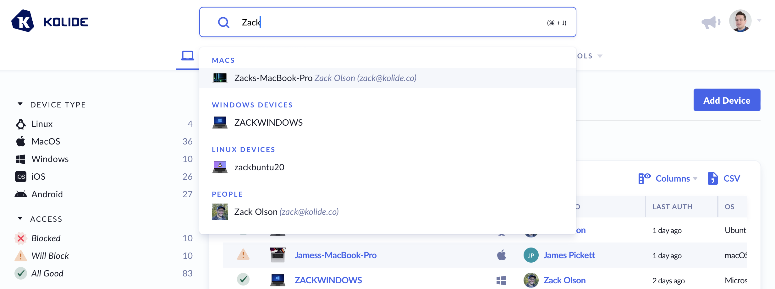 Users with access to the Kolide interface can view all Devices enrolled in Kolide by clicking Devices in the top navigation.