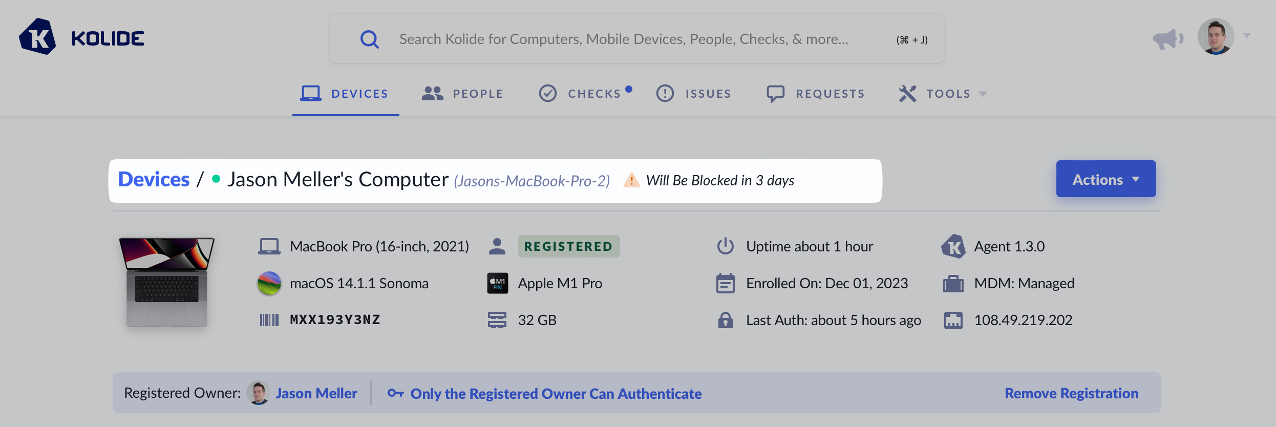 Viewing a Device in Kolide reveals information accessible on the header of the details page: