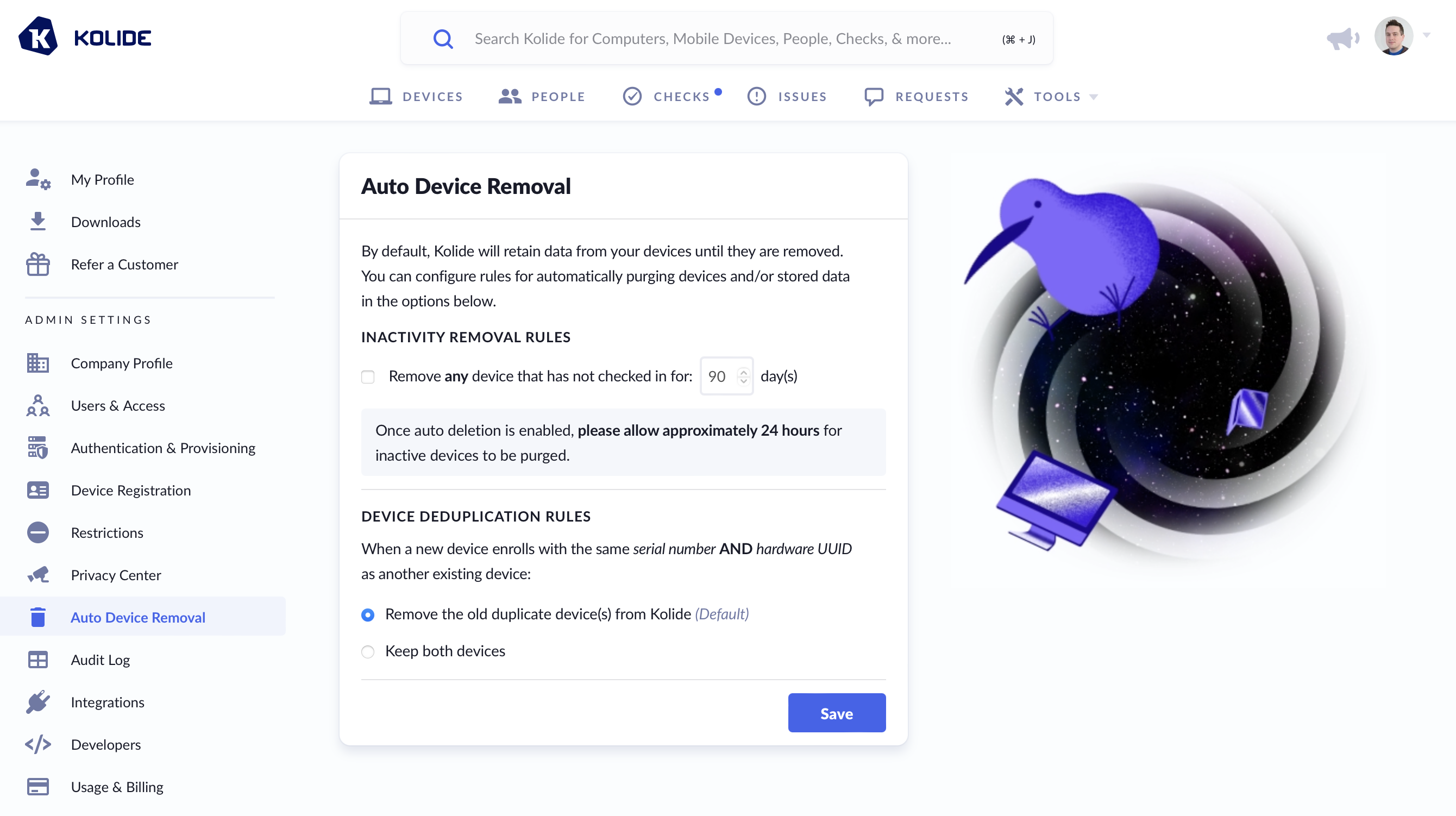 If a Device stops checking in, Kolide can automatically remove it after a customizable period of inactivity (Kolide suggests a value of 90 days for most retention requirements.)