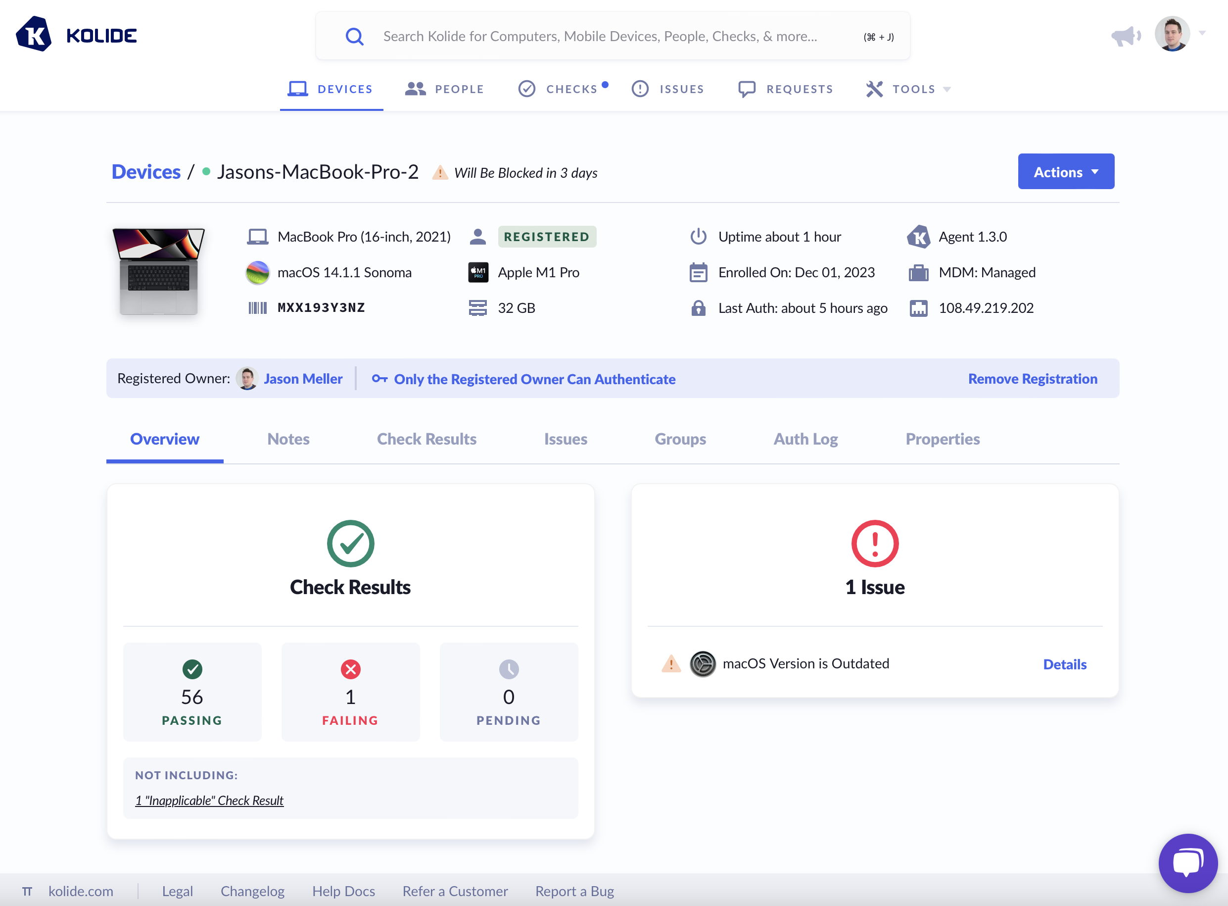 A Device is the primary object to which many other Kolide concepts are directly linked. This includes Check Results, Issues, Registrations, and Device Properties.