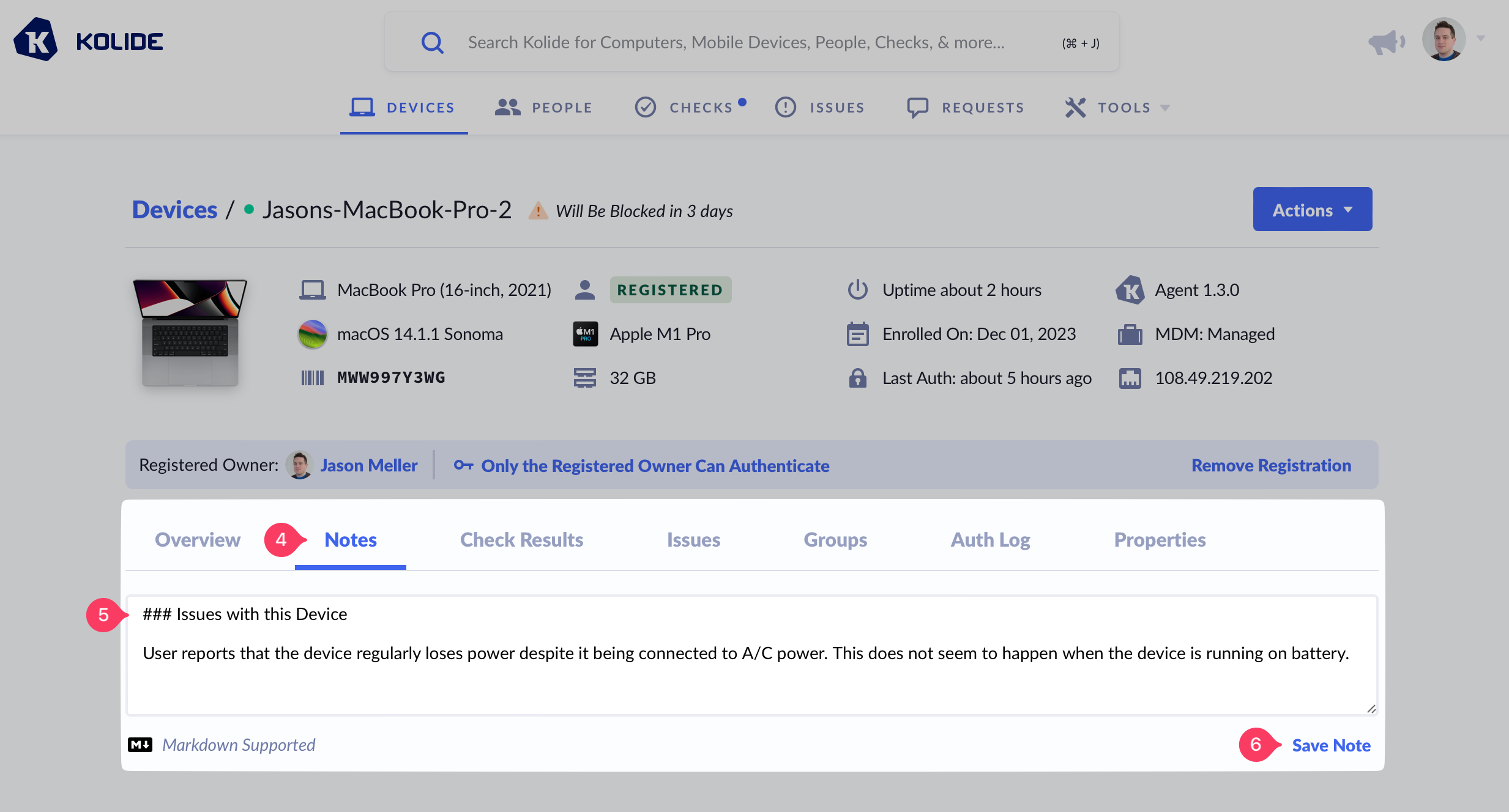 Your note will be displayed with the markdown formatting applied. Additionally, you can view Device notes programmatically via the API.