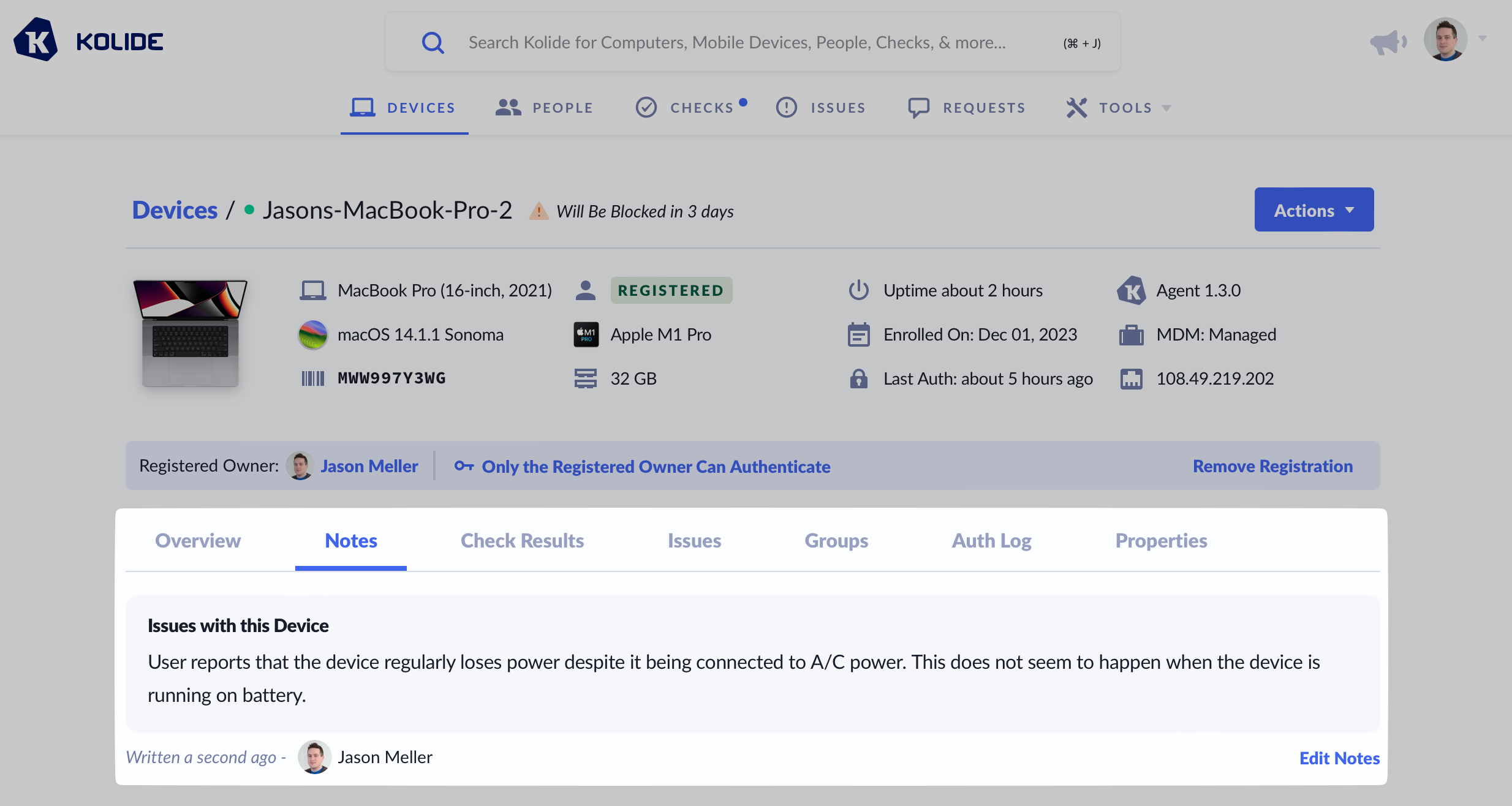 Kolide allows users with access to the management UI to add custom notes to a Device. These notes are useful for remembering details about a Device that Kolide doesn’t automatically collect.
