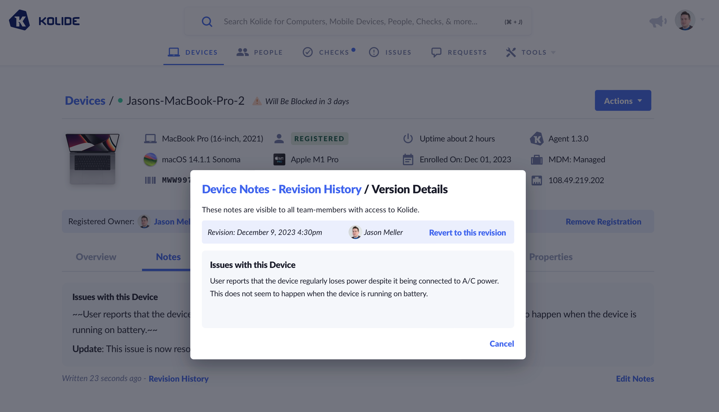 Each time a user modifies a note, Kolide tracks the changes, including who made the change. View these changes by clicking View Revision History. You can revert to a previous version of a note, creating a new version, using the modal.