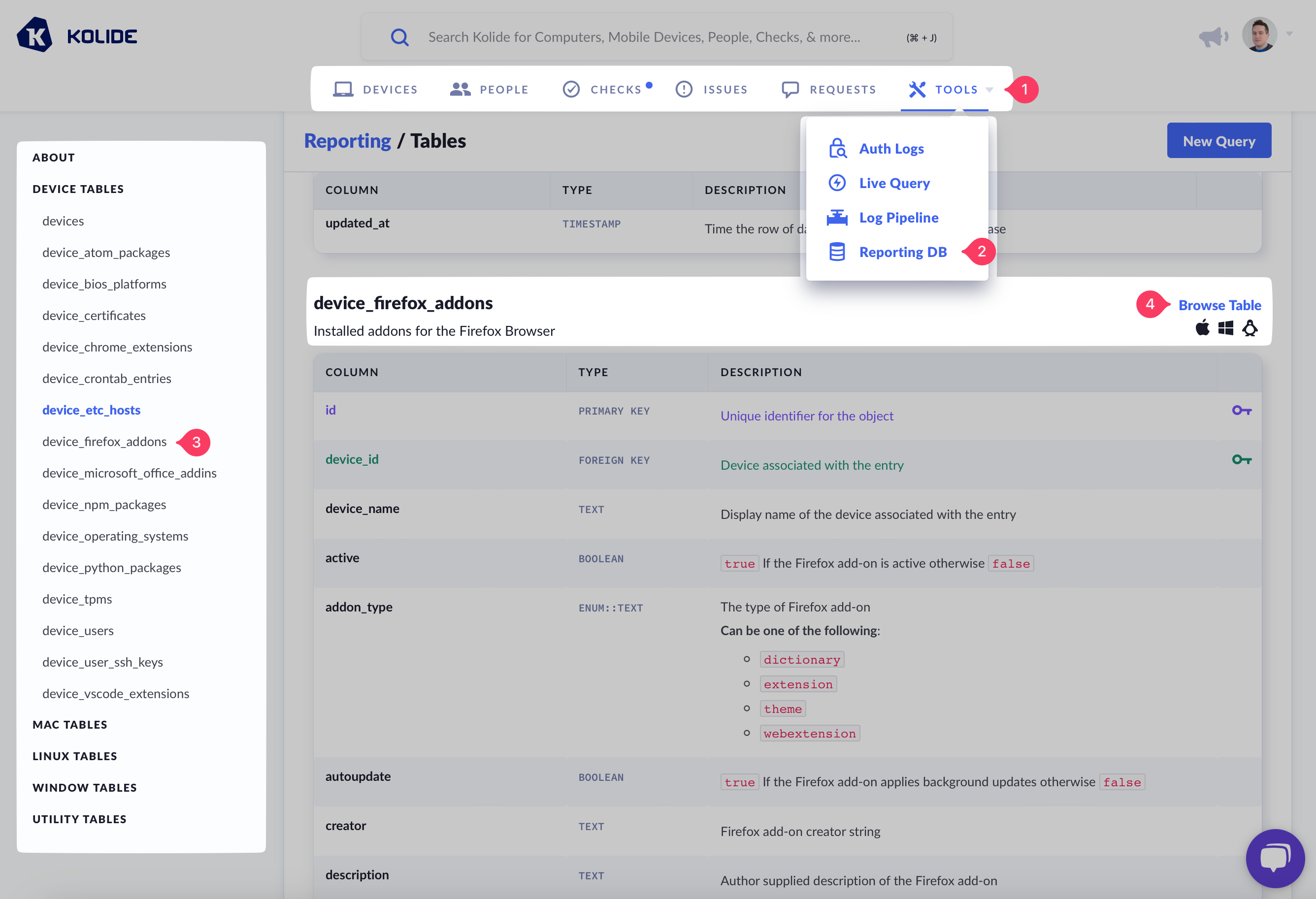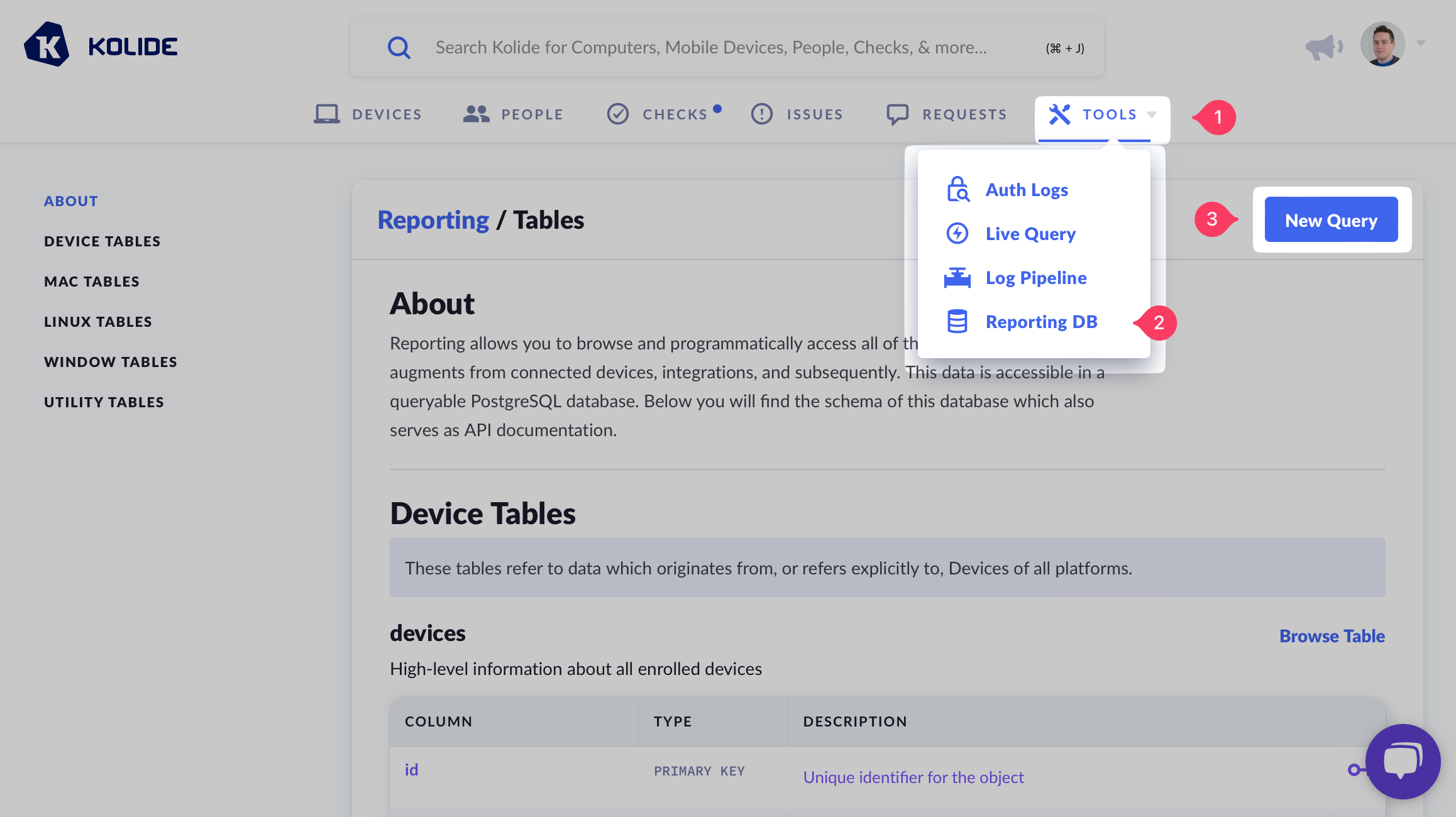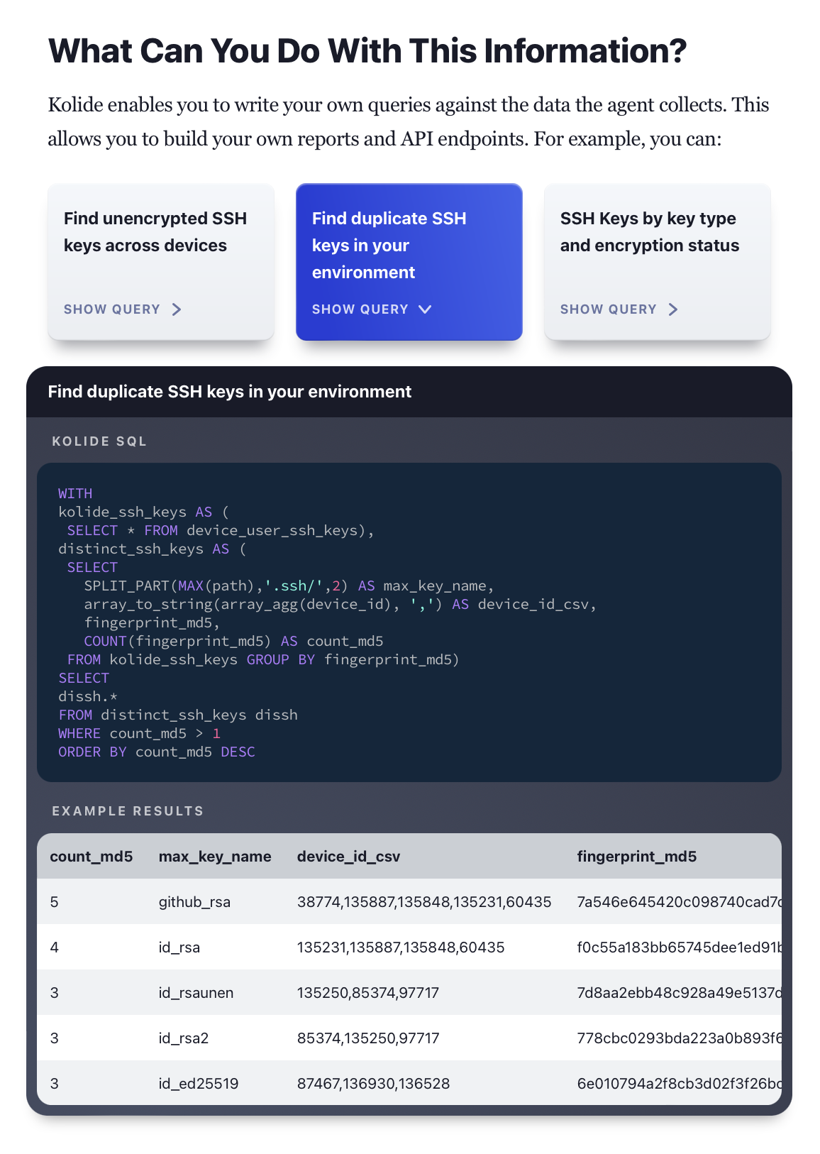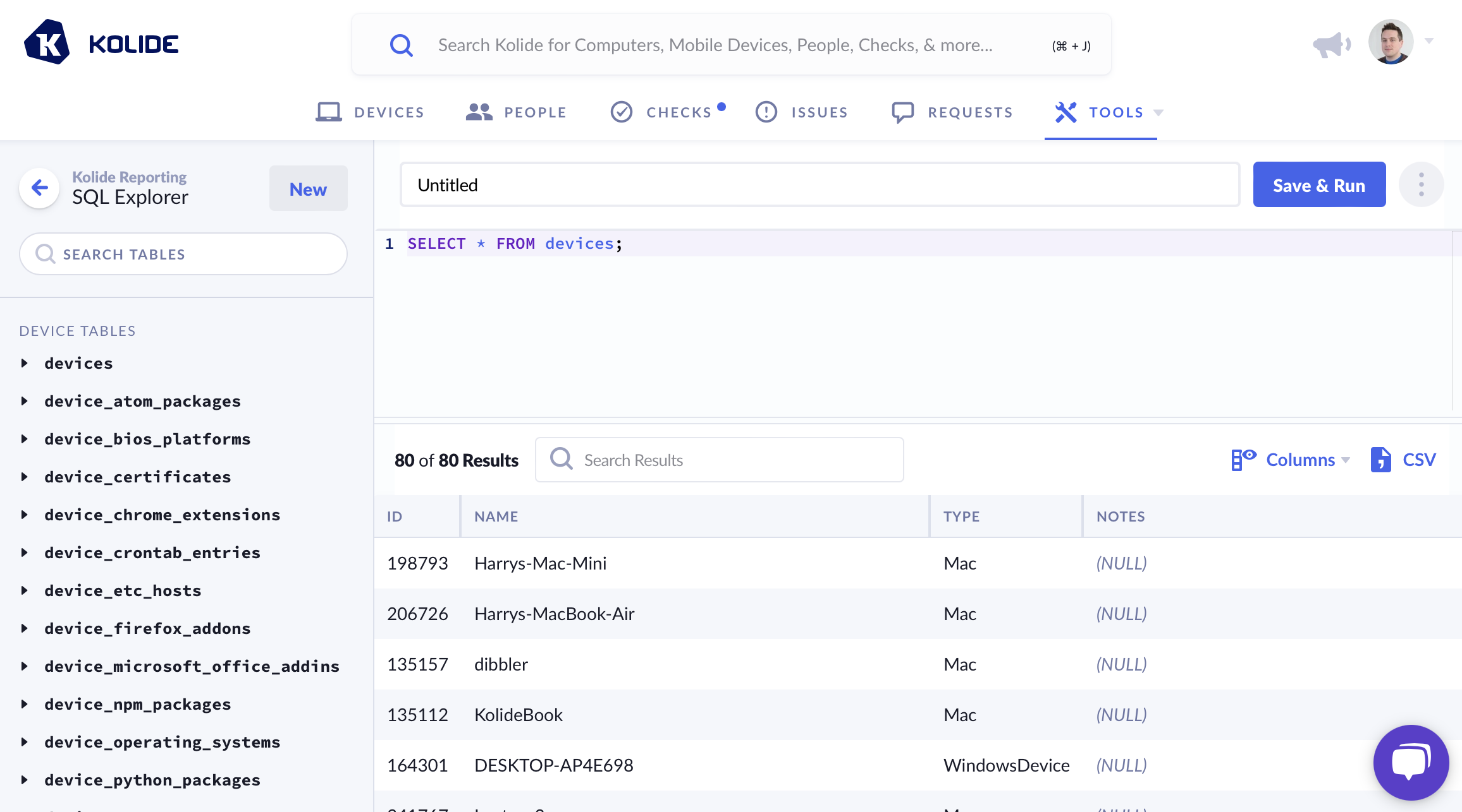 Reporting provides raw access to the underlying data used to populate your Kolide account. This capability allows you to perform complex aggregations and joins across device properties that are not otherwise possible.