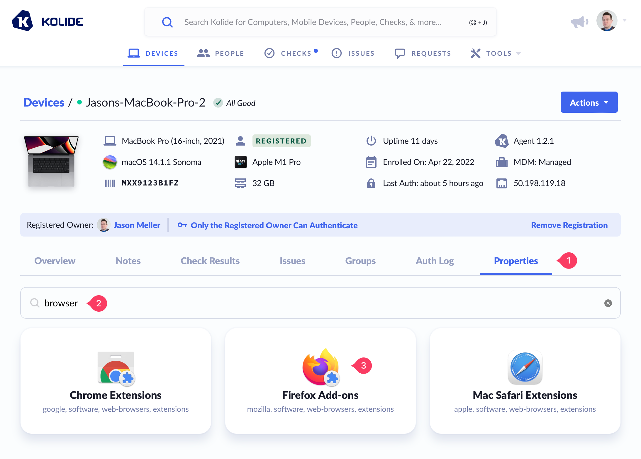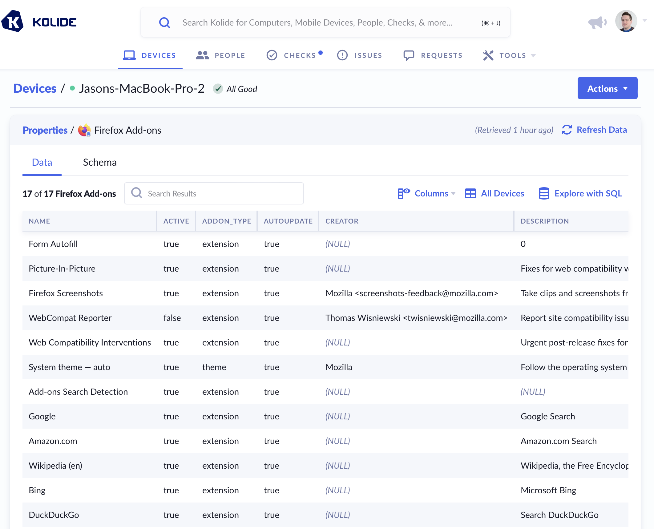 In addition to running checks, Kolide collects a number of useful data points about devices that can help both IT and security practitioners better understand the state of the device.