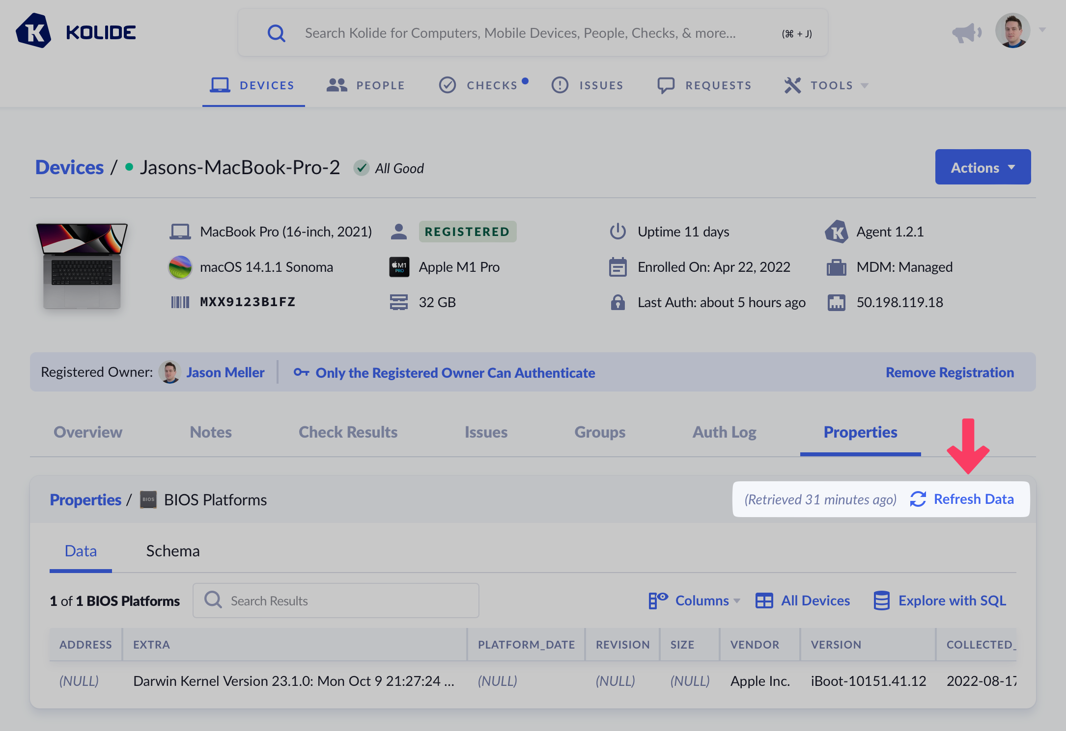 Kolide collects most properties once every two hours when the device is online. To manually refresh data, simply click the Refresh Data button in the upper-right corner of the table.