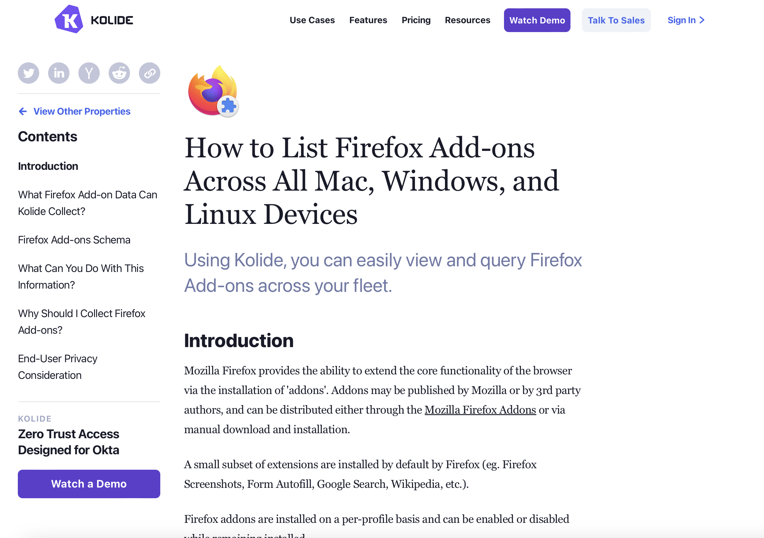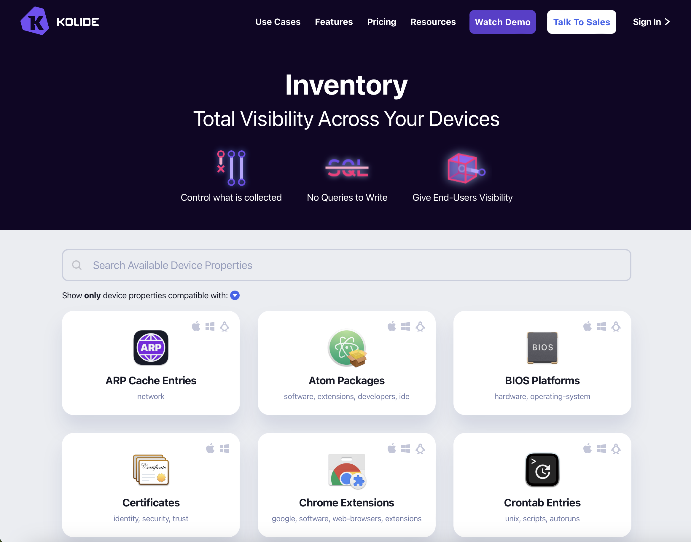 The Kolide website provides complete documentation for each device property Kolide collects.