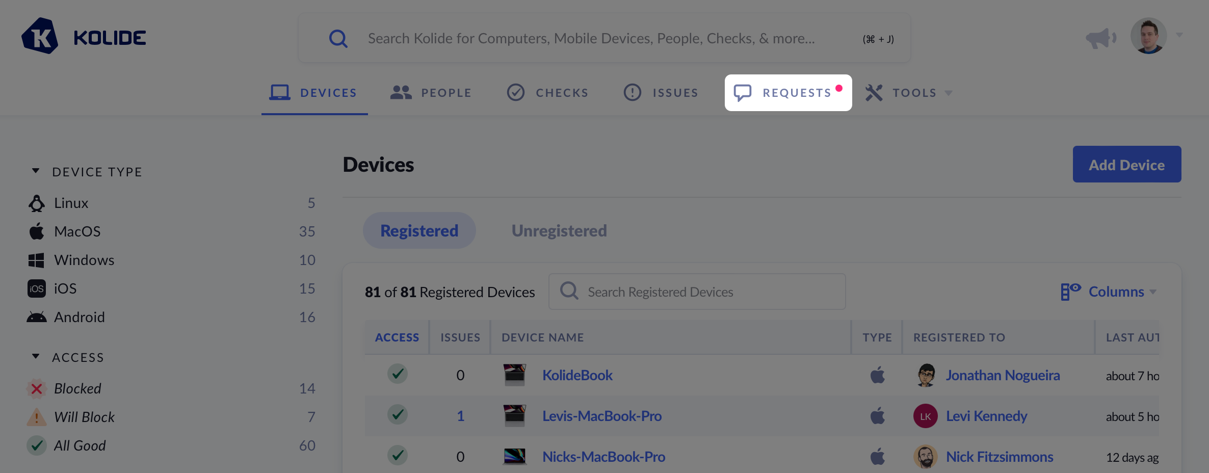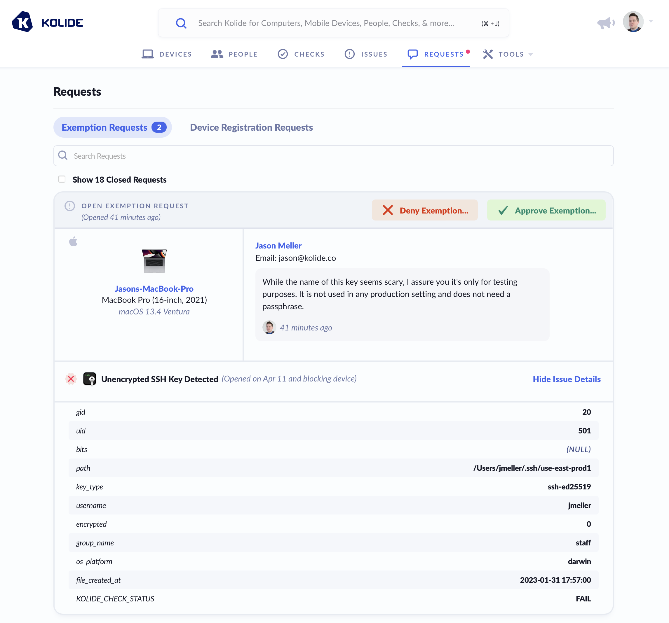Open Exemption Requests can be found by clicking on Requests in the top-level navigation bar in Kolide.