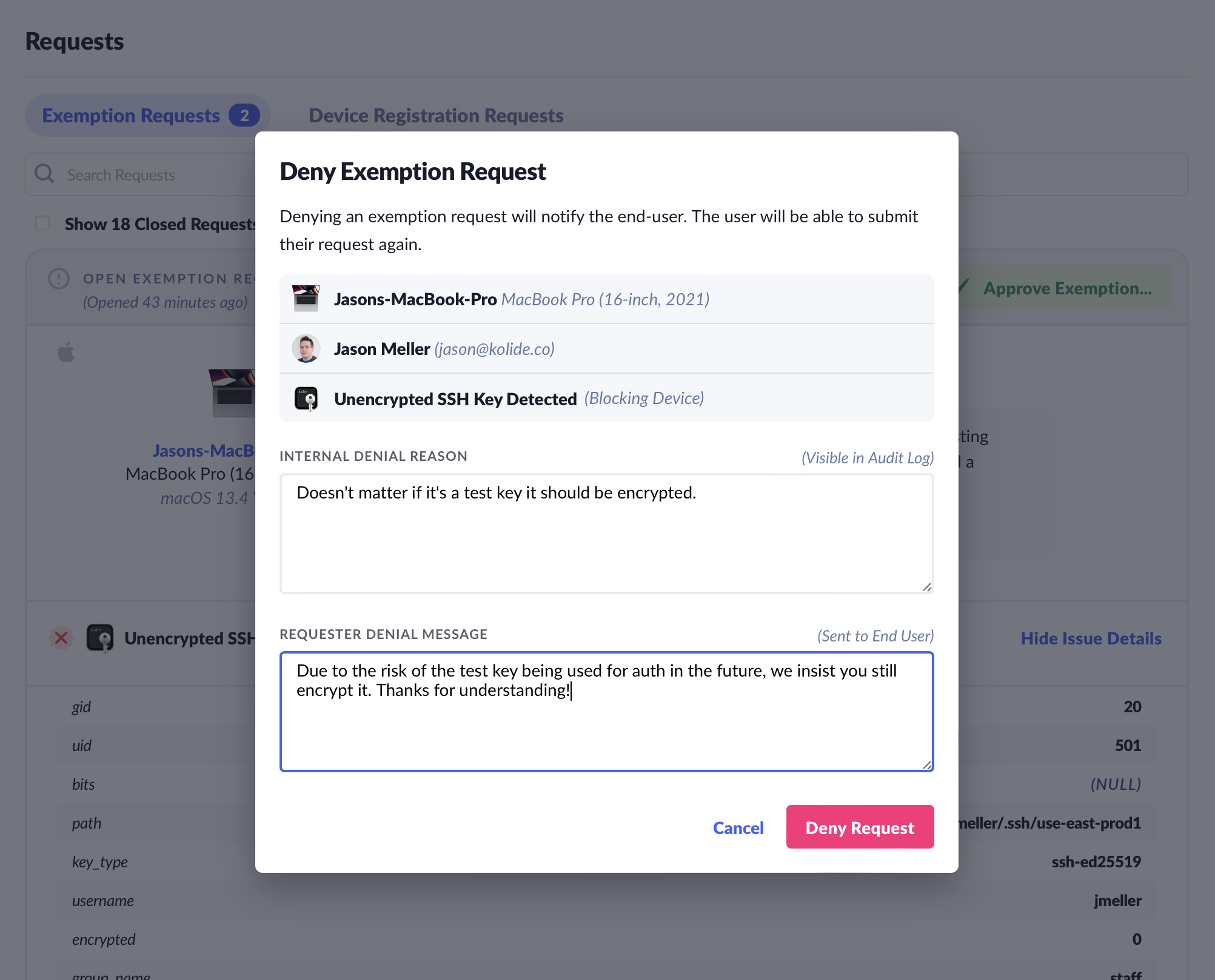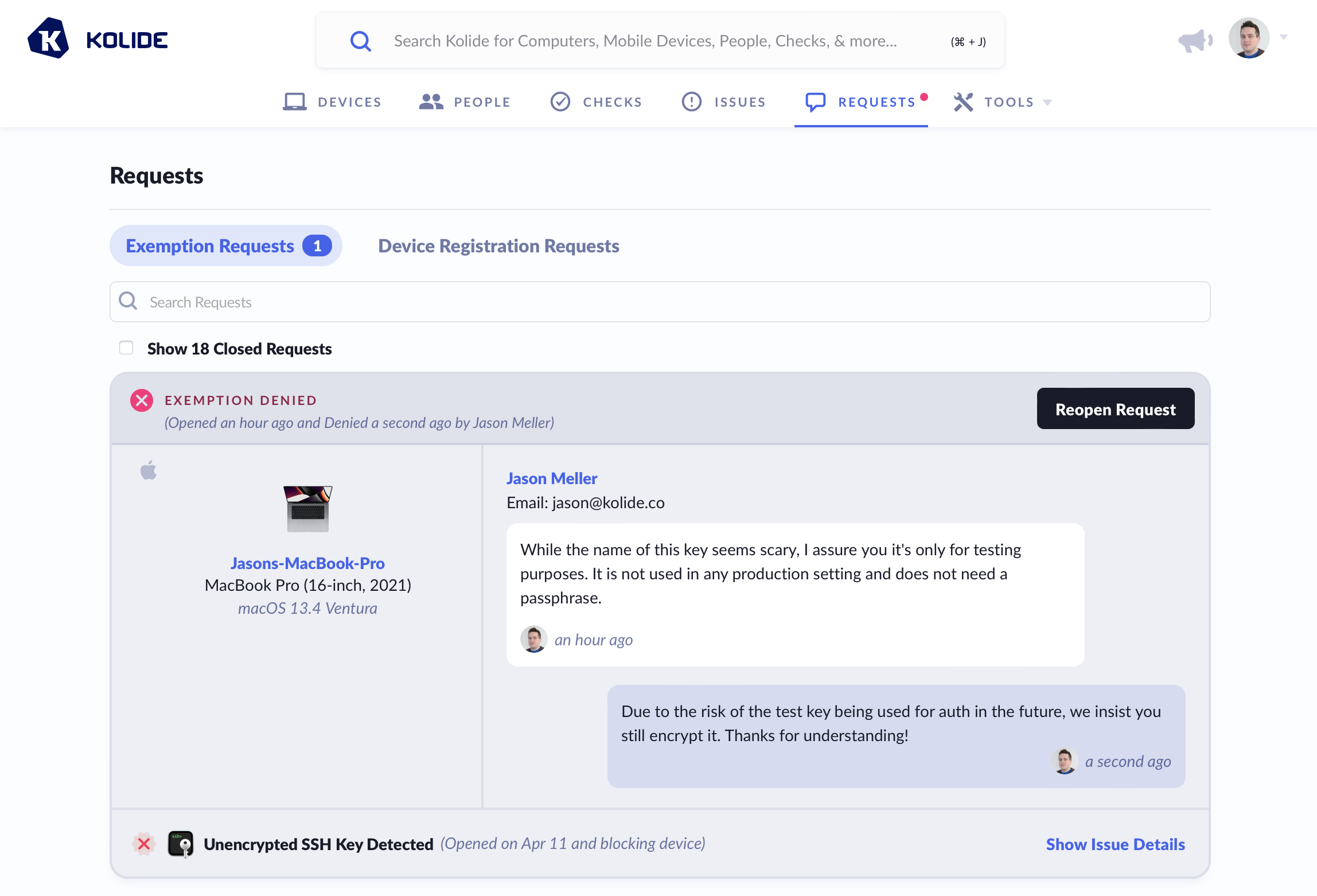 Exemption Requests are a key feature of Kolide’s user-driven remediation process. Essentially, they allow end-users to engage in dialogue with Kolide administrators about Issues that they cannot resolve independently.