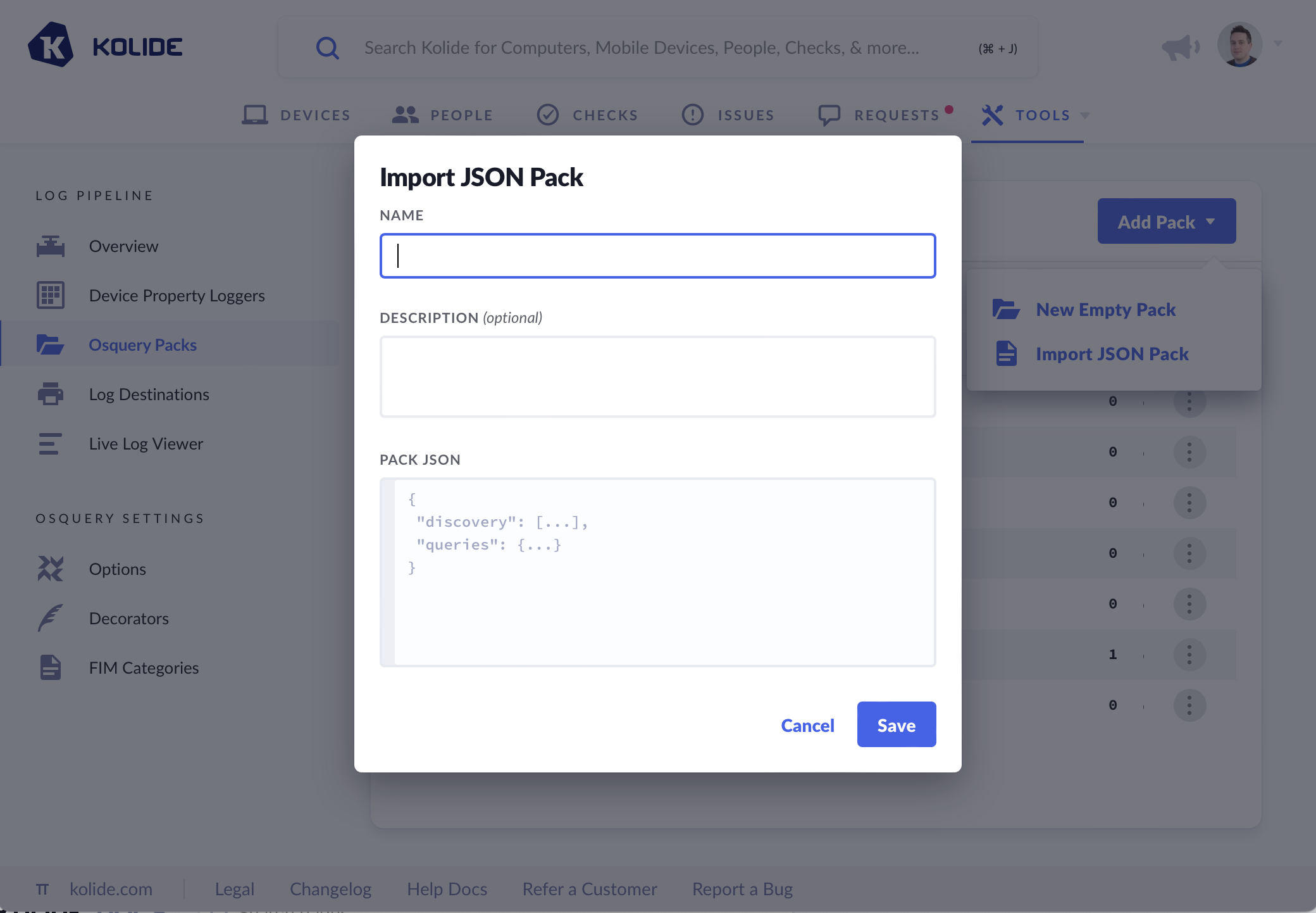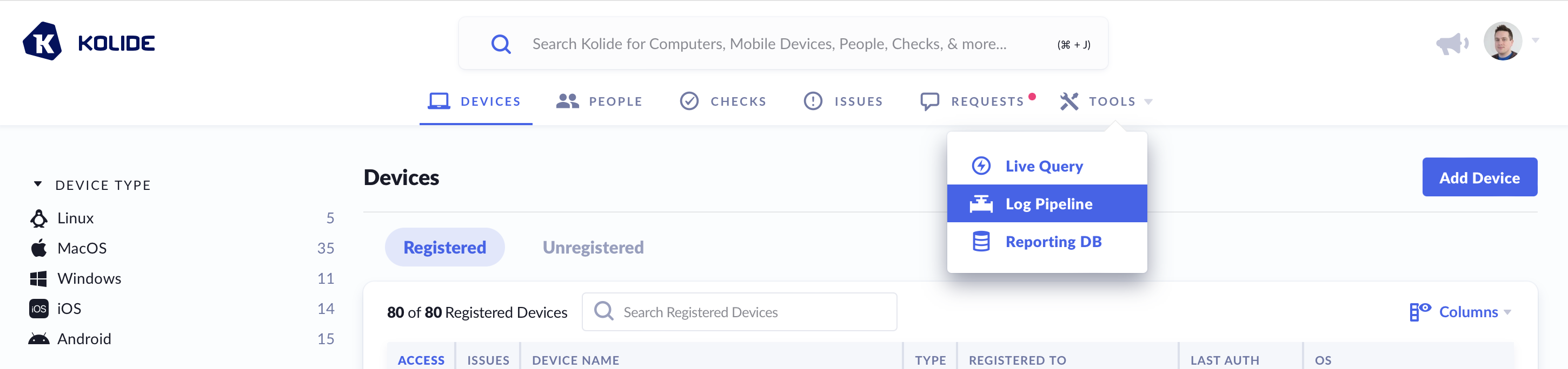 To get started, log into Kolide and click on Tools from top navigation and select Log Pipeline.