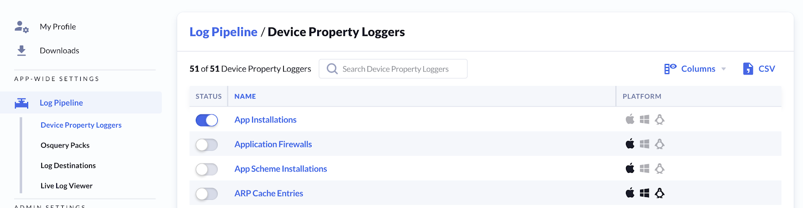 The easiest way to get started with the Log Pipeline is exporting Kolide’s device property data. Without writing any SQL, you can enable logging for any device property available across devices.