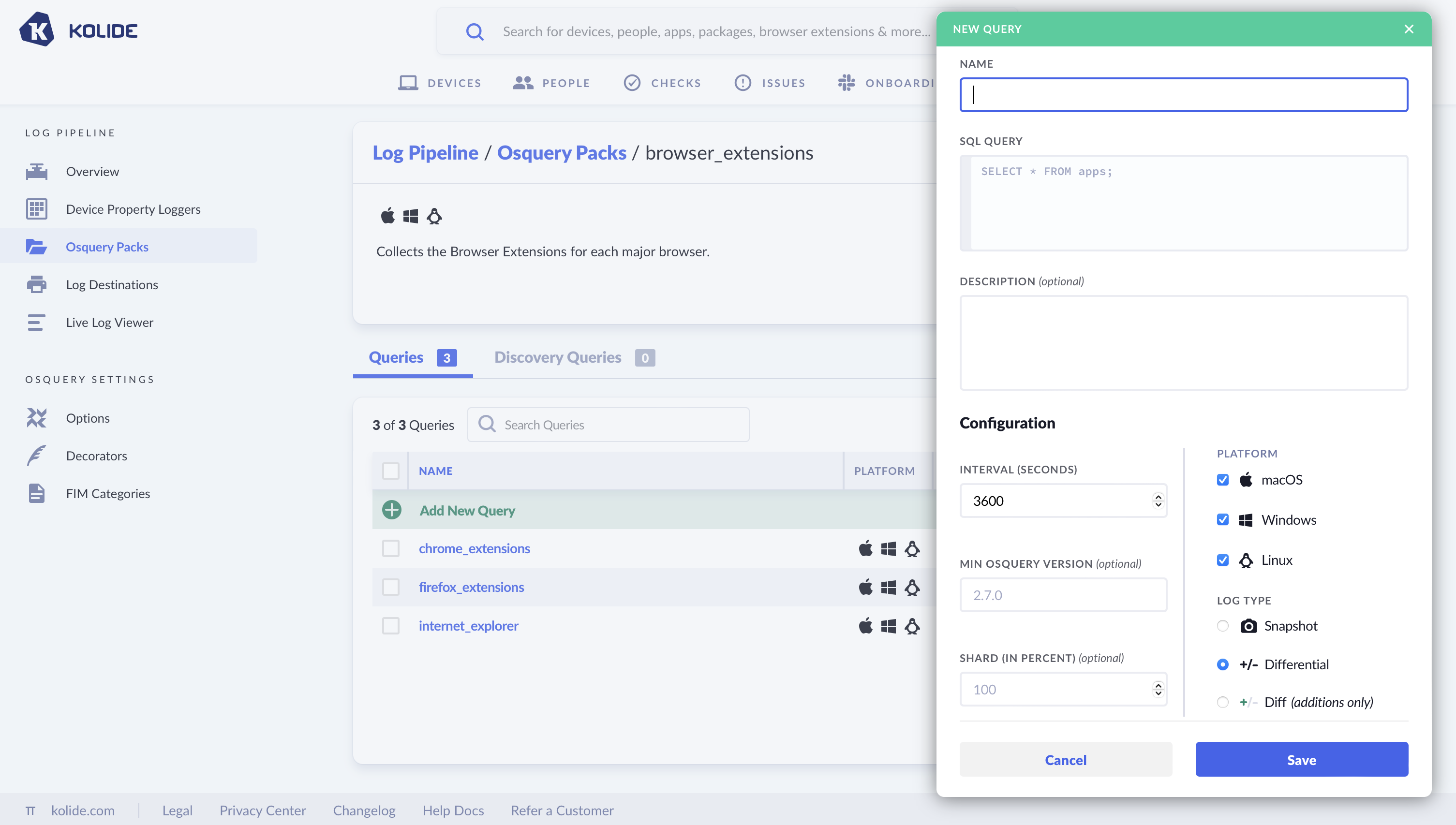 Kolide’s Device Properties and Checks features regularly poll the current state of your devices to provide up-to-date information. For users who wish to forward and store their data outside of Kolide, we offer our Log Pipeline.
