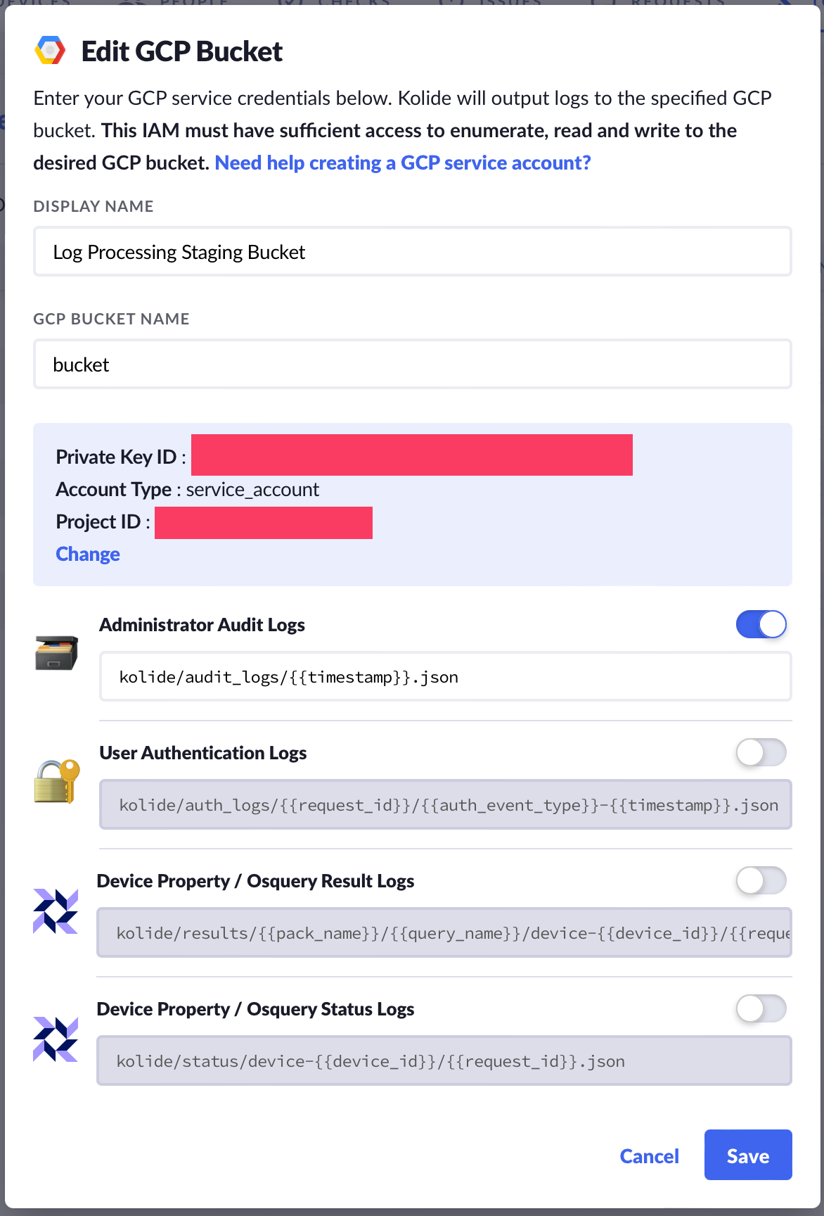 Certain events generated from in-app actions taken in Kolide are available to export via the Log Pipeline. Authentication Logs and Admin Audit Logs can be emitted to your configured log destination: since this data is always generated and stored automatically in the Kolide app, you only need to visit the configuration page for each log destination that should receive this data and enable the desired data source there.