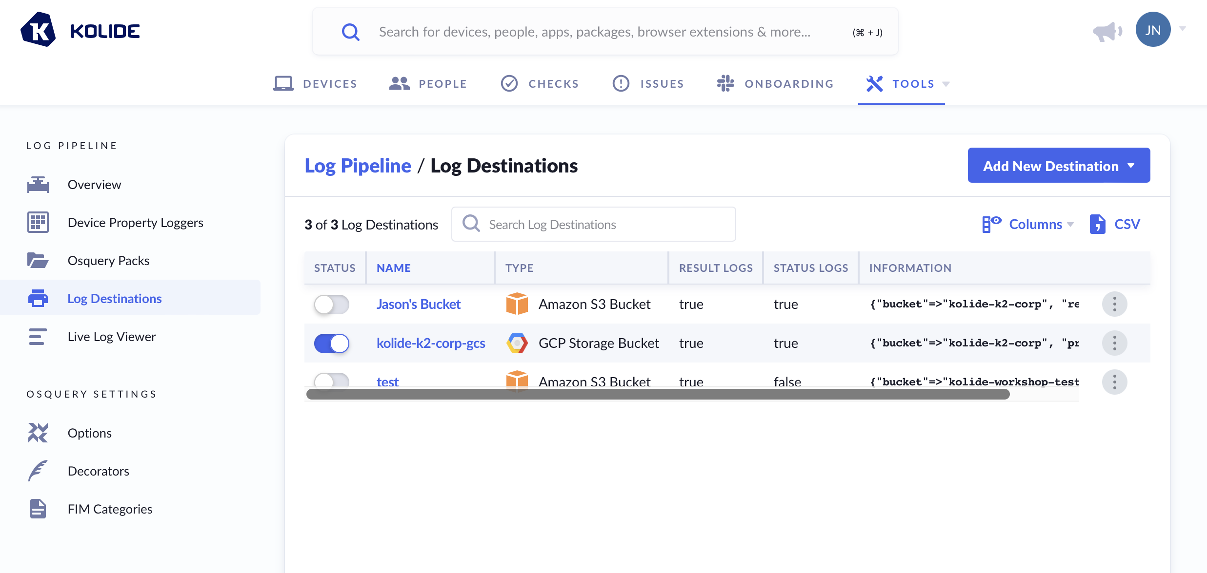 To utilize the Log Pipeline, you will need to configure at least one destination where Kolide can forward logs. The supported Log Destinations types are: