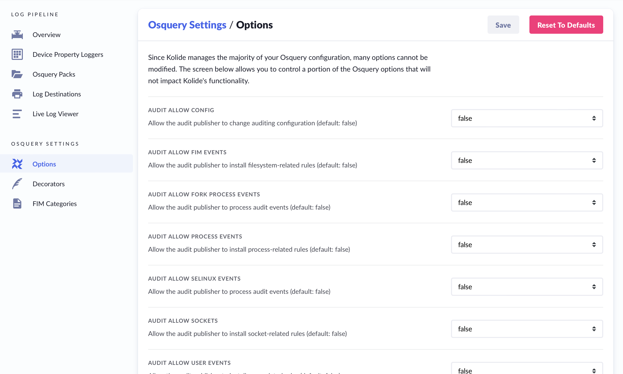 You can configure additional osquery specific settings by going to Options under osquery settings. Here you can adjust customizable options for the underlying osquery agent.